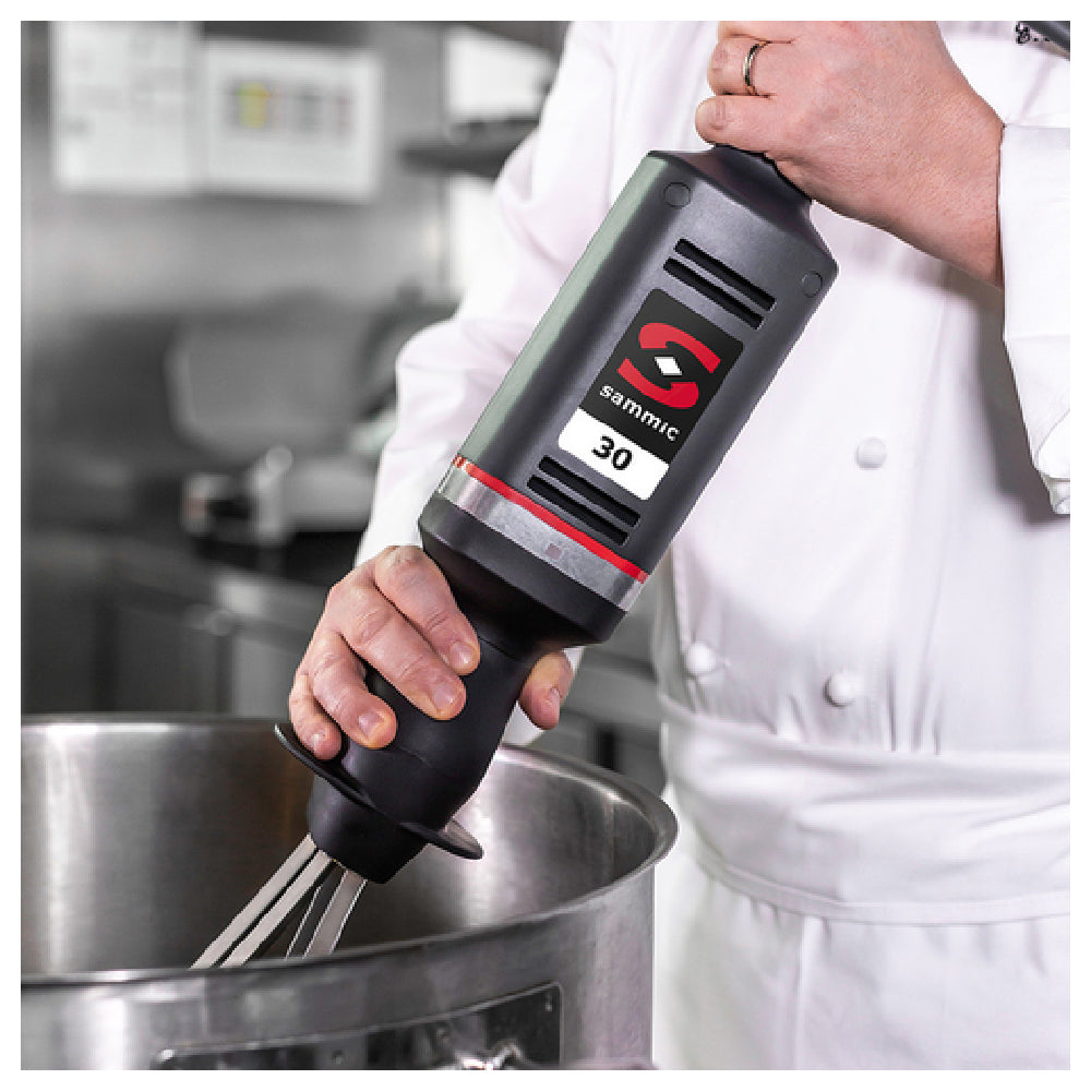 Sammic, B-30, (3030807) Commercial Mixer Hand Whisk, wall mount, 30 liters (32 qt.) capacity, 28-27/32"L O.A.L. with revolving arm, 15-3/5" stainless steel whisk, 50 egg whites capacity, Ergo-design, Bi-Mat-Grip with anti-slip material, continuous run option, LED warning light in two colors and sfety power indication light, various speed motor block 200-1,500 rpm, .54 HP, 400 watts, 120v/50/60/1-ph, NEMA 5-15P, NSF, CE, ETL, cETLus