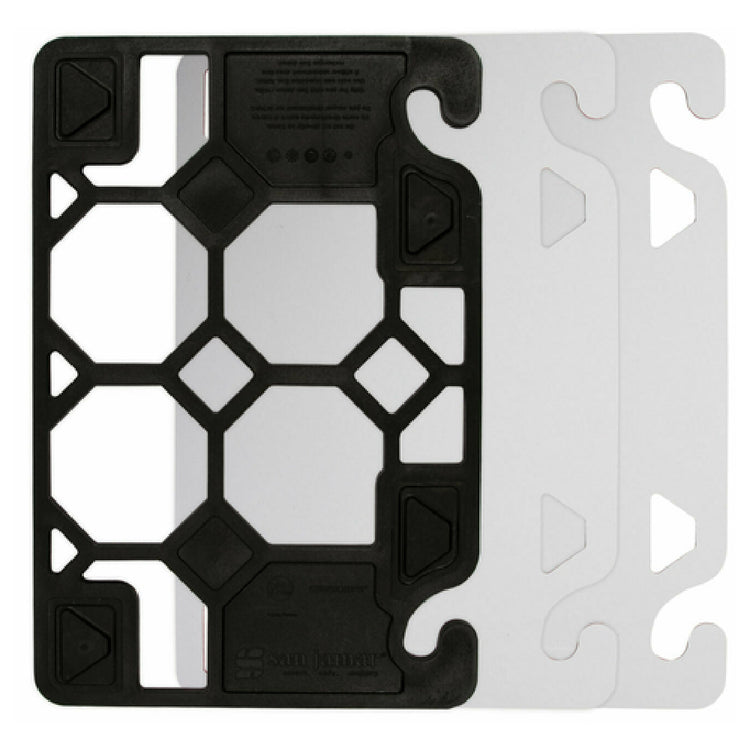 The San Jamar CBQGSCSK1520 QuadGrip™ Smart Check™ Cutting Board Starter Kit 15" X 20" is a comprehensive kitchen tool designed to enhance food safety and efficiency in professional culinary environments. This versatile starter kit includes a black non-slip rubber frame that secures the cutting board in place, ensuring stability during use. The kit also features two white double-sided cutting boards, offering ample surface area for various food preparation tasks. Each board is equipped with food safety hooks, promoting hygienic handling and storage. An integrated ruler adds precision to culinary tasks, making it ideal for detailed food presentation. Crafted from co-polymer, these cutting boards are both durable and dishwasher safe, ensuring they meet the demands of busy kitchens while maintaining ease of cleaning. The inclusion of NSF certification highlights the product’s adherence to public health and safety standards, making it a reliable choice for restaurants, catering businesses, and other food service operations. The San Jamar CBQGSCSK1520 is engineered to marry practicality with stringent safety protocols, providing an indispensable tool for any kitchen focused on maintaining high standards of food hygiene and operational efficiency.