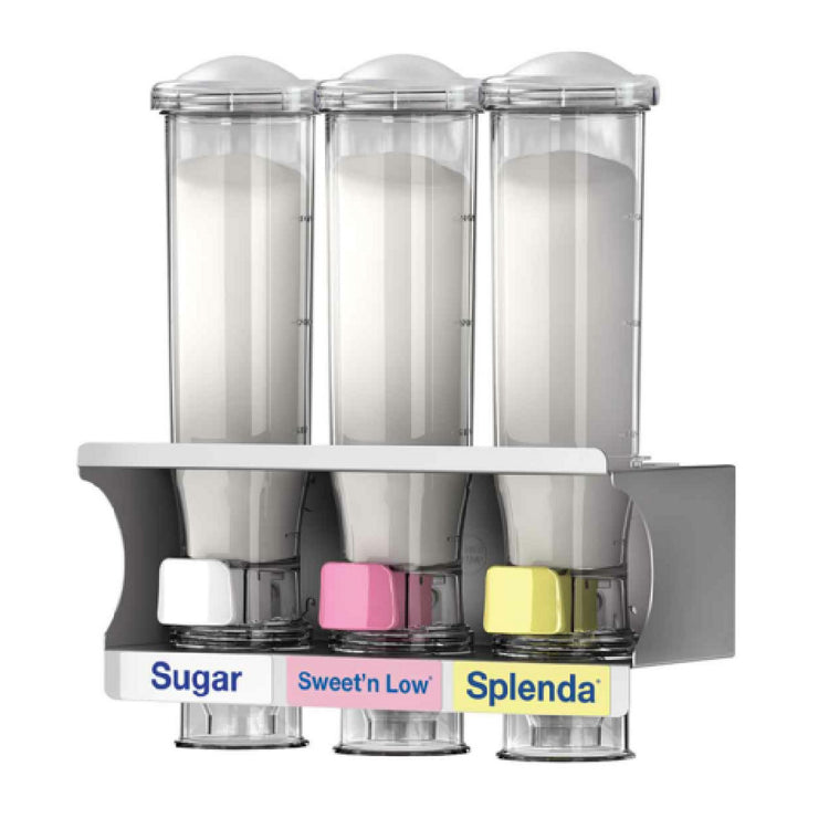 The Server Products 80103 SWTS SWEETSTATION™ Dispenser Triple 24 oz. Wall-mounted Rack is an innovative solution designed to streamline sweetener dispensing in food service environments. This efficient system features a wall-mounted rack equipped with three 24 oz. InSweeten™ dispensers. These dispensers facilitate single-handed serving of preset sweetener portions, matching the equivalent of common portion packs, enhancing operational efficiency. The configuration includes one dispenser with a 2.8 gram white trigger, and two dispensers with 1 gram yellow, pink, and blue triggers, allowing for precise portion control. Each dispenser comes with color-coded flavor decals for Sugar, Sweet'n Low®, Splenda®, and Equal®, ensuring easy identification and versatility in use. This product is BPA free, aligning with health and safety standards, and is NSF certified, attesting to its compliance with public health protection guidelines. The Server Products 80103 SWEETSTATION™ represents a practical choice for cafes, restaurants, and other food service establishments seeking a reliable and sanitary sweetener dispensing solution. Its thoughtful design and durable construction make it a valuable addition for those aiming to enhance customer experience through efficient and organized service.