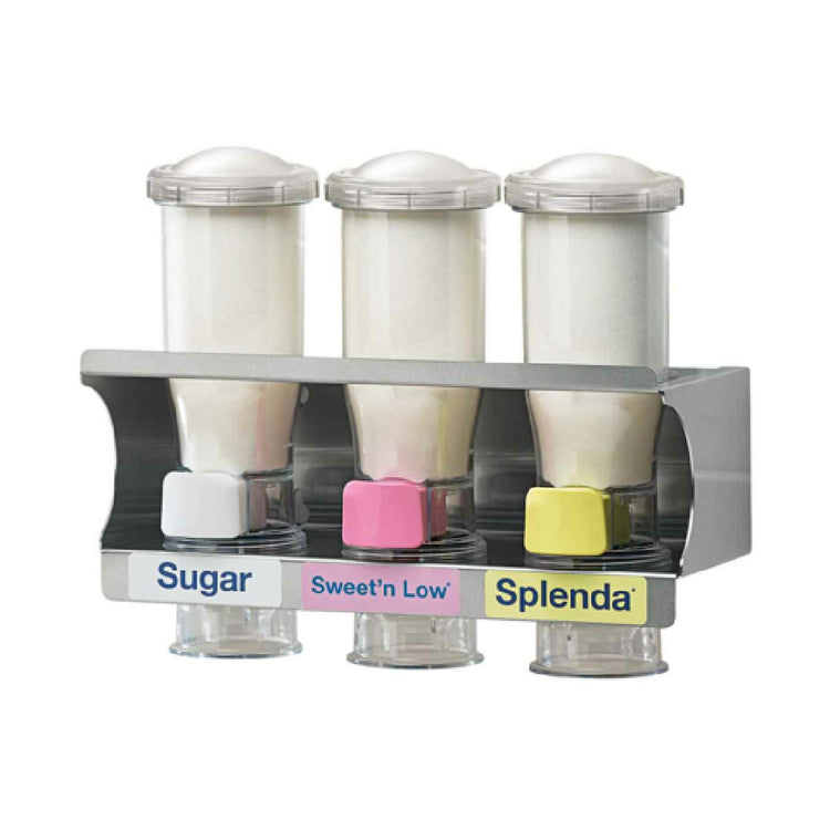 The Server Products 80104 SWTS SWEETSTATION™ DISPENSER TRIPLE 14 OZ. Wall-mounted Rack is a versatile and efficient solution designed for commercial and institutional spaces requiring organized sweetener dispensing. This unit features three individual 14 oz. capacity InSweeten™ dispensers, allowing for single-handed operation to serve preset sweetener portions that match common portion packs. The product includes one dispenser equipped with a 2.8 gram white trigger and two additional dispensers with 1 gram triggers in yellow, pink, and blue, enhancing user convenience with color-coded options. Complementary flavor decals are provided for Sugar, Sweet'n Low®, Splenda®, and Equal®, ensuring quick identification and ease of use. This dispenser unit is BPA Free, aligning with modern health standards, and is certified by NSF, verifying its compliance with public health and safety norms. The SWEETSTATION™ is especially suited for cafes, restaurants, or any food service environments prioritizing both efficiency and organization in condiment service. Its wall-mounted design not only saves counter space but also contributes to a tidy and uncluttered serving area, making it a valuable asset for various market segments within the food service industry.