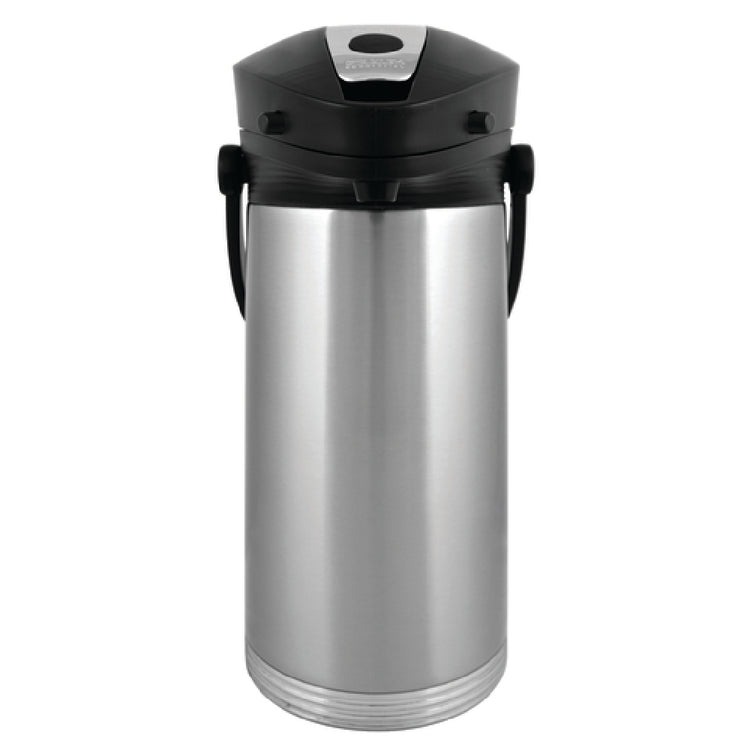 Service Ideas, 10-00189-000, Stanley® Commercial ErgoServe® Airpot, 3 liter (101.4 oz.), 6-1/2" x 8-1/2" x 15", retention: 4-6 hours, stainless steel liner, lever style, black lid, zinc die-cast lever, ergonomic carry handle, Ferrostat™ vacuum insulated, hand wash (do not submerge), 18/8 stainless steel, brushed finish, NSF