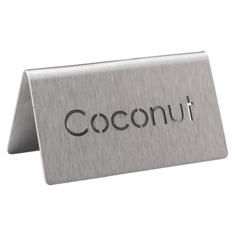 Service Ideas, 1C-BF-COCONUT-MOD, Beverage ID Tent, "Coconut", 1-1/2"H x 3"W, laser-cut, dishwasher safe (hand washing is recommended), 18/8 stainless steel, brushed finish, Made in USA (Priced per each, packed 6 each per case)