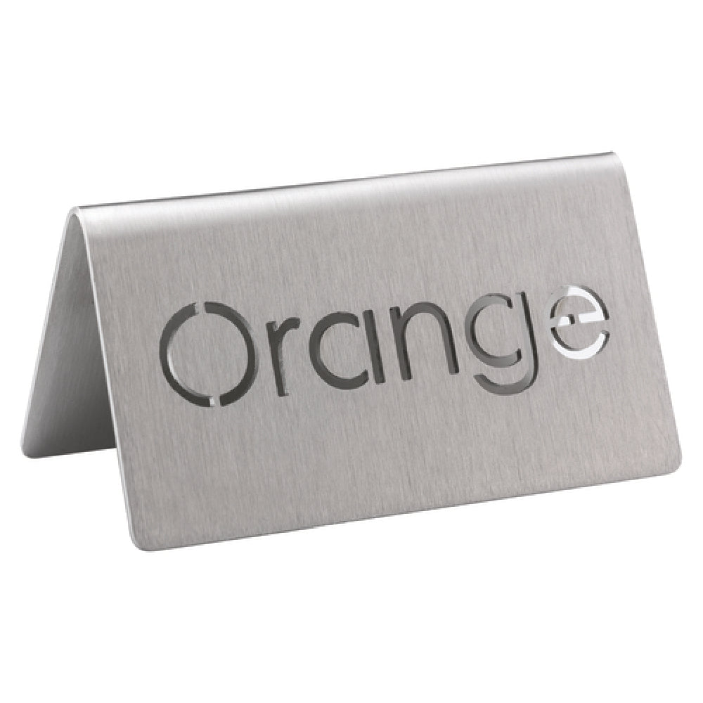 Service Ideas, 1C-BF-ORANGE-MOD, Beverage ID Tent, "Orange", 1-1/2"H x 3"W, laser-cut, dishwasher safe (hand washing is recommended), 18/8 stainless steel, brushed finish, Made in USA (Priced per each, packed 6 each per case)