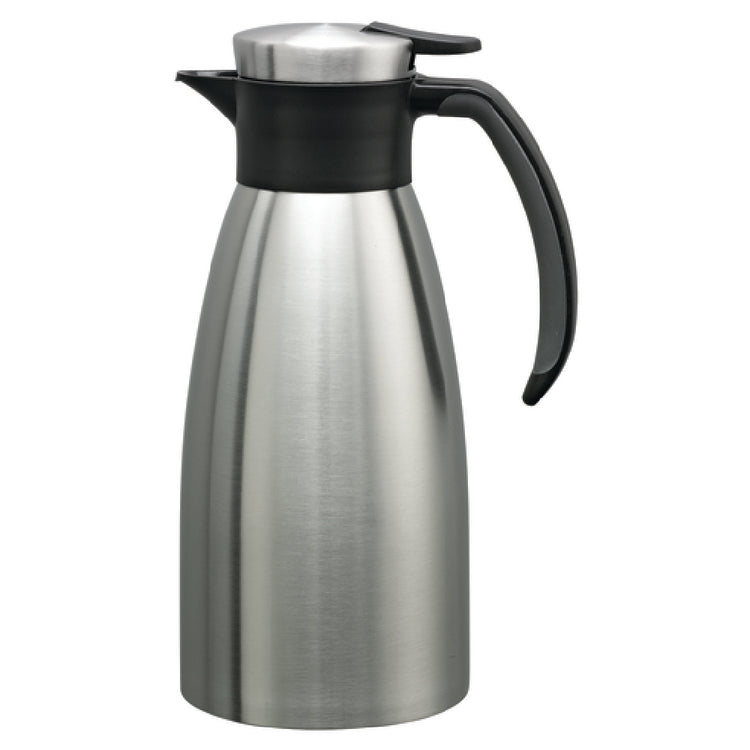 Service Ideas, 83710, Carafe Server, 1 liter (33.8 oz.), 4-3/4" x 5-3/4" x 9-1/2", slim design, retention: 4-6 hours, over molded non-slip handle, hand wash, stainless vacuum insulation, push button lid with no-drip spout, 18/8 stainless steel, brushed finish (Priced per each, packed 6 each per case)