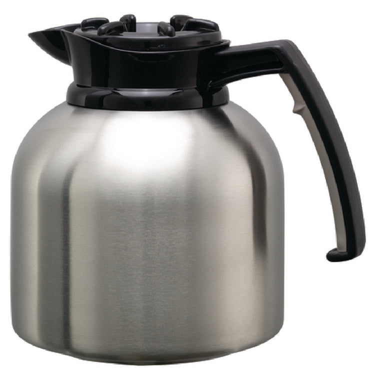 Service Ideas, BNP19BL, Brew 'N' Pour® Carafe, 1.9 liter (64.2 oz.), 6-1/2" x 8-1/2" x 7-3/4"H, heat retention 4-6 hours, ergonomic handle, dishwasher safe, vacuum insulation, black brew-thru lid, 18/8 stainless steel, brushed finish, NSF (Priced per each, packed 6 each per case)