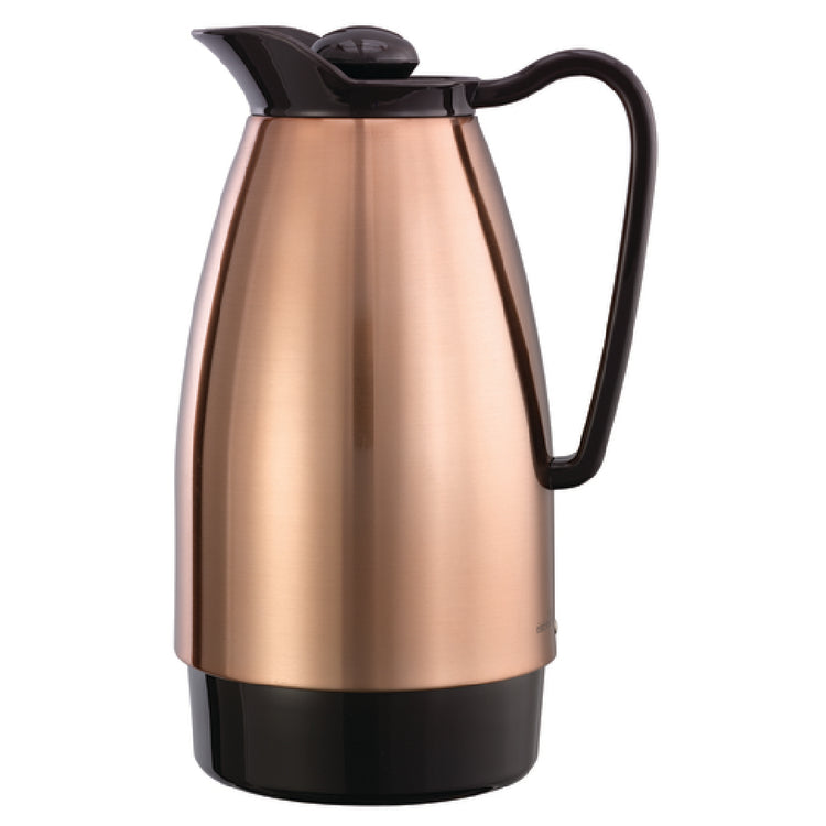 Service Ideas, CGC101CP, Classic Carafe, 1 liter (33.8 oz.), 4-1/2" x 6-1/4" x 10", retention: 6-8 hours, hand wash (do not submerge), glass lined, vacuum insulation, dripless spout, tamper proof stopper lid, 18/8 stainless steel, copper (Priced per each, packed 6 each per case)