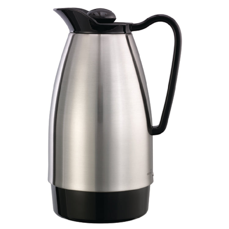 Service Ideas, CGC101SS, Classic Carafe, 1 liter (33.8 oz.), 4-1/2" x 6-1/4" x 10", retention: 6-8 hours, hand wash (do not submerge), glass lined, vacuum insulation, dripless spout, tamper proof stopper lid, 18/8 stainless steel, silver (Priced per each, packed 6 each per case)