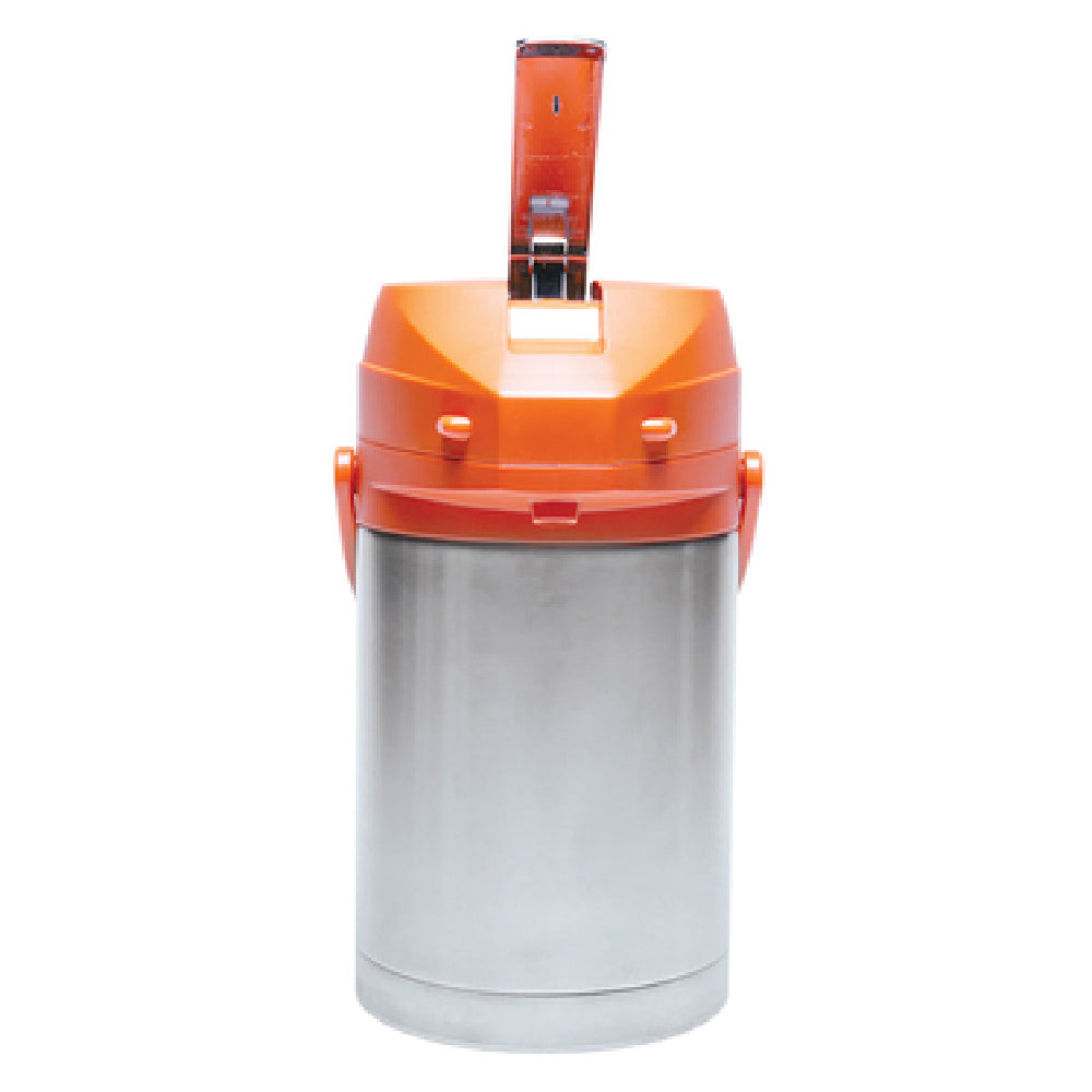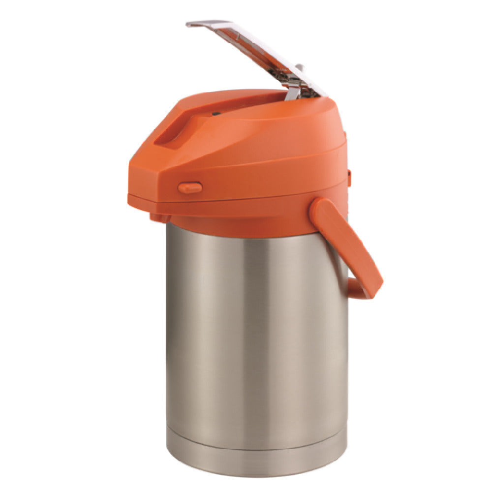 Service Ideas, CTAL22OR, Airpot, 2.2 liter (74.4 oz.), 6-3/4" x 8-3/4" x 11-1/2", retention: 4-6 hours, vacuum insulated, lever style, stainless steel liner, orange lid, hand wash (do not submerge), 18/8 stainless steel, brushed, NSF (Priced per each, packed 6 each per case)