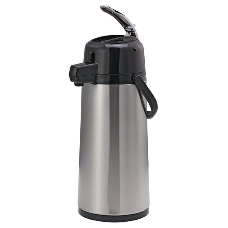 Service Ideas, ECAL19S, Eco-Air® Airpot, 1.9 liter (64.2 oz.), 6" x 8" x 15", retention: 6-8 hours, smooth body, glass liner, lever style, black lid, vacuum insulated, hand wash (do not submerge), stainless steel, brushed, NSF (Priced per each, packed 6 each per case)