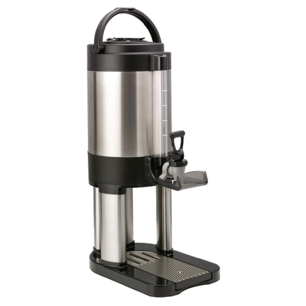 Service Ideas, GIUSL1G, Thermal Container, 1 gallon (128 oz.), 10-3/4" x 16-1/4" x 23-1/2", slim design, brew-thru top, heat retention: 4-6 hours, stainless steel interior, splash guard on spigot, handles on lid, molded-in rubber carry handle, removable base, two replacement sight glass tubes & brush stored behind capacity gauge, drip tray, vacuum insulation, hand wash, brushed stainless steel, NSF (Priced per each, packed 6 each per case)
