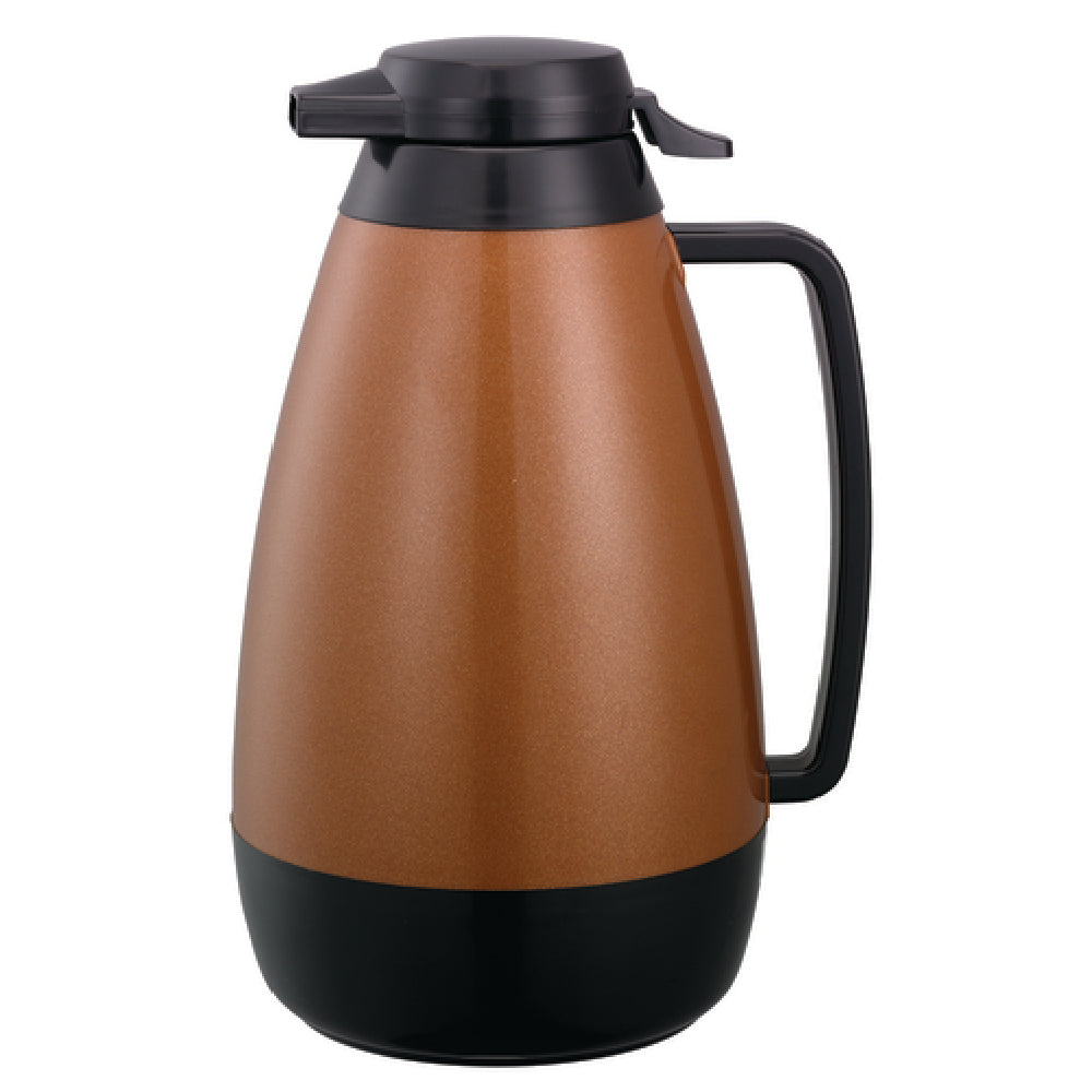 Service Ideas, PB421CB, Thermo-Serv® Push-Button Server, 2 liter (67.6 oz.), 4-1/2" x 7" x 11", retention: 2-3 hours, dishwasher safe, smooth body, welded seams, reinforced handle, double-wall, foam insulated, non-drip spout, ABS plastic, copper/black, BPA Free, Made in USA (Priced per each, packed 6 each per case)