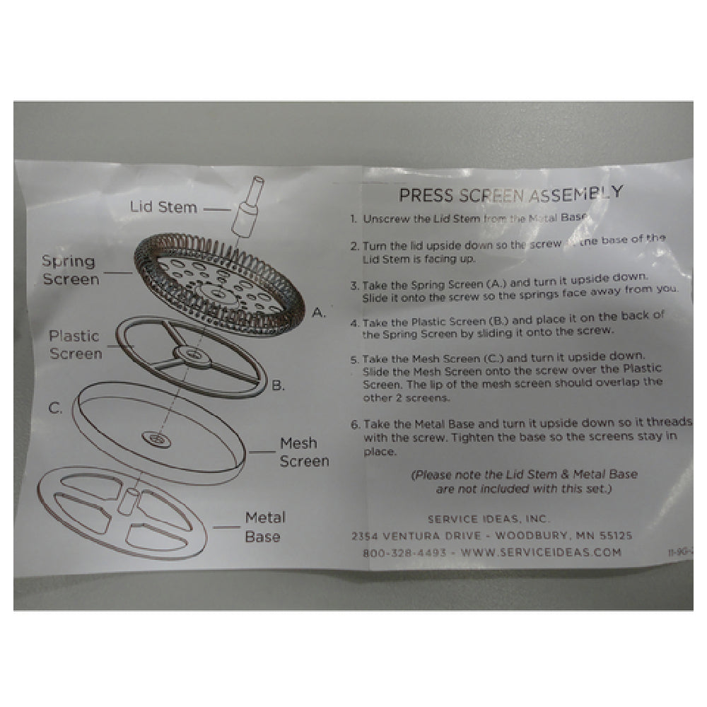 Service Ideas, PRESSCRN800/1000, Replacement Screen Set, for T677B, T677BRNZ, T899SRT877B & T877BRNZ, includes: (1) spiral, (1) mesh & (1) fine mesh, hand wash, stainless steel (Priced per each, packed 400 each per case)