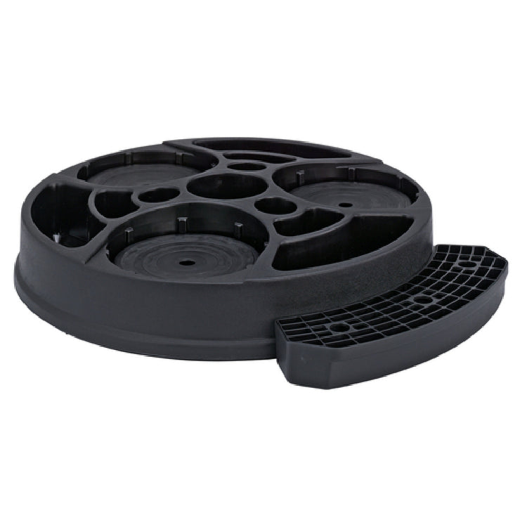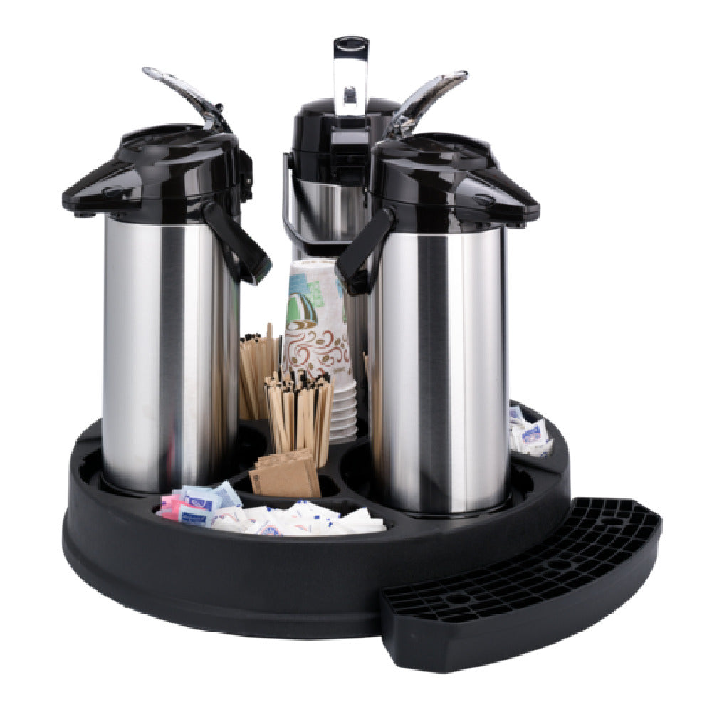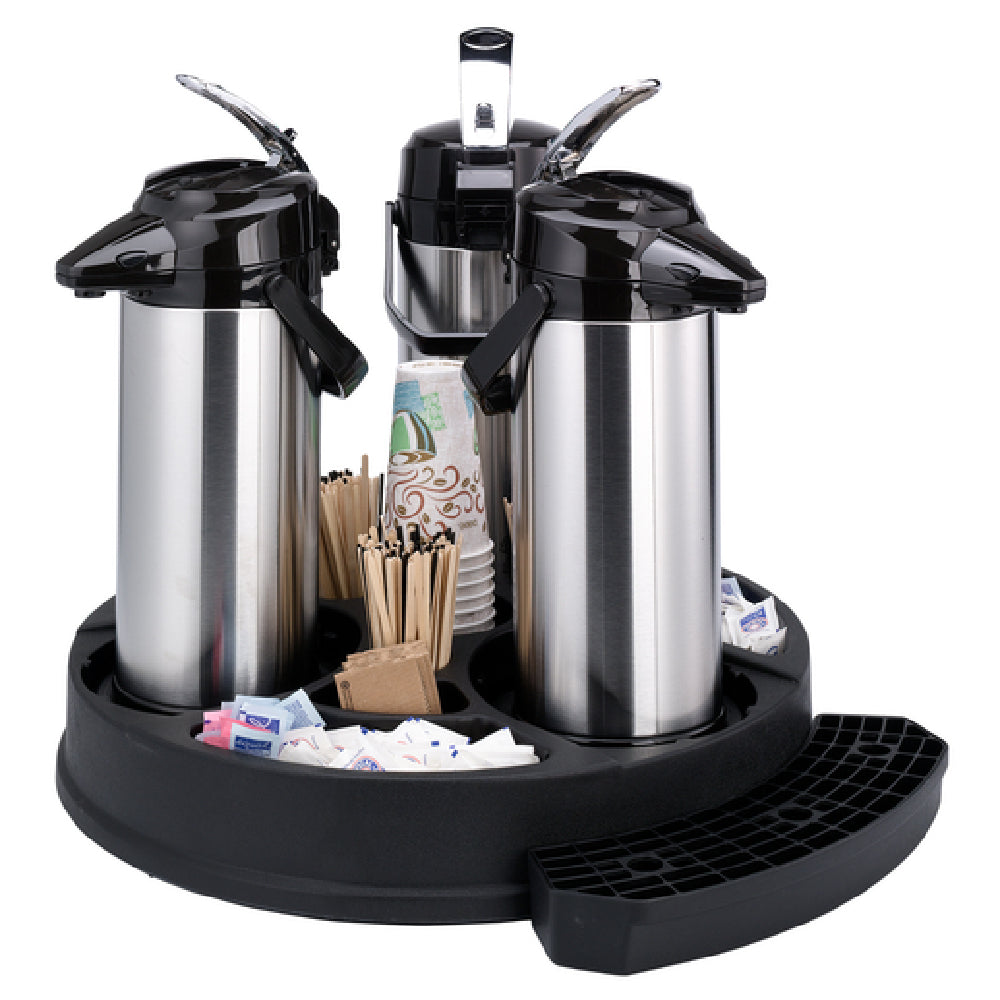 Service Ideas, RRAP3BLK, Roto Rack™ Airpot Serving Rack, 22" x 22" x 3-3/4", lazy susan, holds (3) airpots (airpots sold separately) with 7-1/2" dia. base, condiment holders, drip tray, adjustable disks, hand wash, plastic, black (Priced per each, packed 6 each per case)