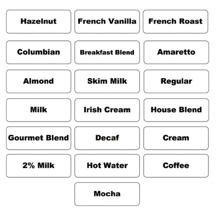 Service Ideas, SC1VPABCL, Static Cling Labels, variety pack, includes: (1) milk, (2) 2% milk, (1)skim milk, (1) cream, (1) hot water, (1) coffee, (1) decaf, (1) regular, (1) breakfast blend, (1) Colombian, (1) French roast, (1) gourmet blend, (1) house blend, (1) almond, (1) amaretto, (1) French vanilla, (1) hazelnut, (1) Irish cream & (1) mocha, 1-1/4", clear sheet with black lettering, 20 labels per sheet, Made in USA