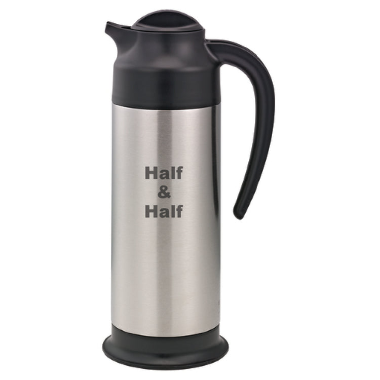 Service Ideas, SSN100HHET, SteelVac™ Vacuum Creamer, 1 liter (33.8 oz.), 4-1/2" x 6" x 11-1/2", "Half & Half" etched on side, retention: 4-6 hours, dishwasher safe, smooth body, double-wall, unbreakable liner, screw-on lid, black plastic footed base, stainless steel, brushed, NSF (Priced per each, packed 6 each per case)