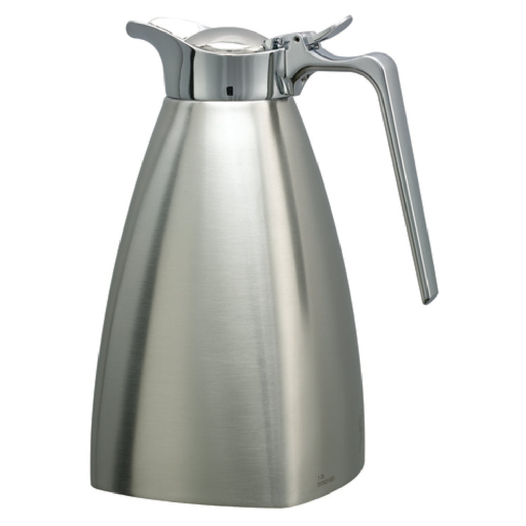 Service Ideas, SVSQ10BS, Coffee Server, 1 liter (33.8 oz.), 4-3/4" x 6-1/2" x 8-3/4", square, retention: 4-6 hours, dishwasher safe, with metal stopper lid, stainless steel-lined, vacuum insulation, stainless steel, brushed finish (Priced per each, packed 6 each per case)
