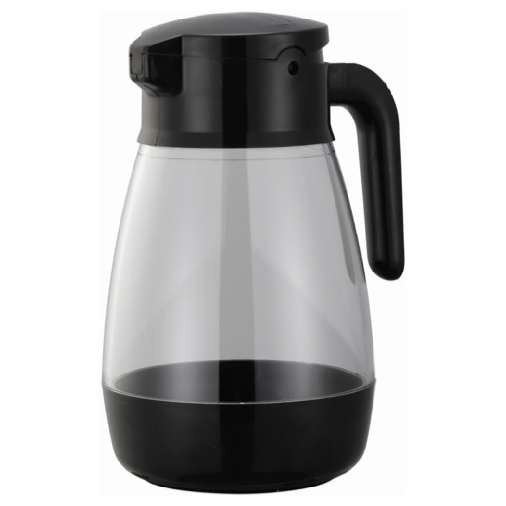 Service Ideas, SY916BL, Syrup Saver™ Syrup/Topping Dispenser, 16 oz., 3" x 4-1/4" x 5-3/4", dishwasher safe, uninsulated, self-locking lid, dripless, flow-controlled spout, plastic construction, black, Made in USA (Priced per each, packed 6 each per case)