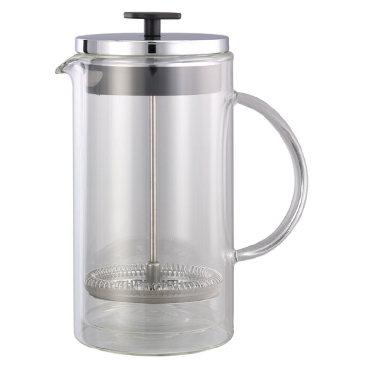 Service Ideas, T899SR, French Coffee Press, 1 liter (33.8 oz.), 4-1/2" x 6-3/4" x 8-1/2", includes: lid, spiral screen, mesh screen & fine mesh screen, dishwasher safe (hand wash screen and plunger), double wall insulated, glass liner, chrome lid (Priced per each, packed 12 each per case)