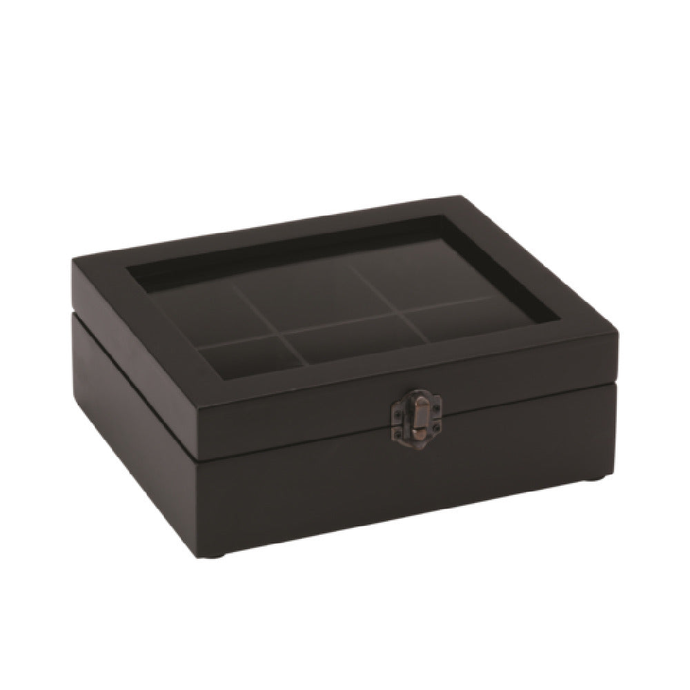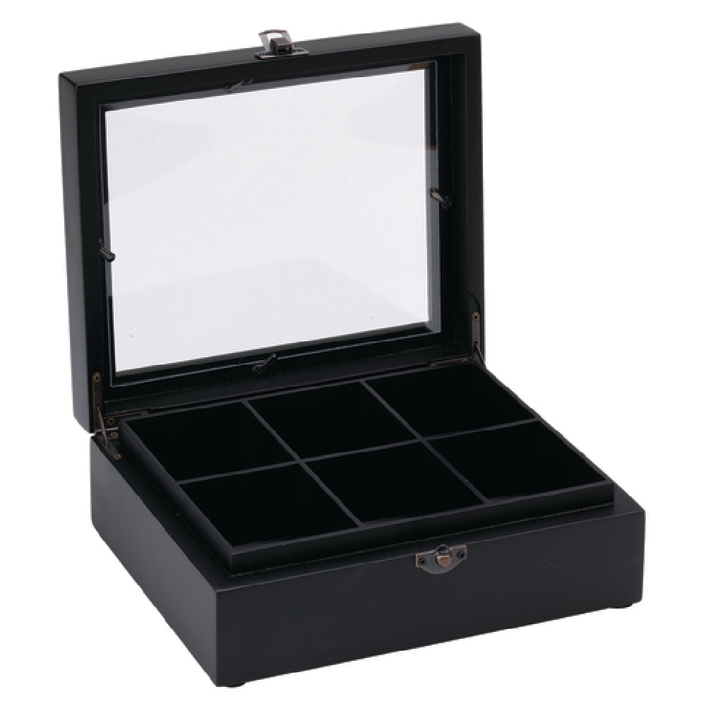 Service Ideas, TB006, Tea Box, 8-1/2" x 7-1/4" x 3"H, (6) compartment, window top, hand wash, metal clasp, beechwood, black (Priced per each, packed 12 each per case)