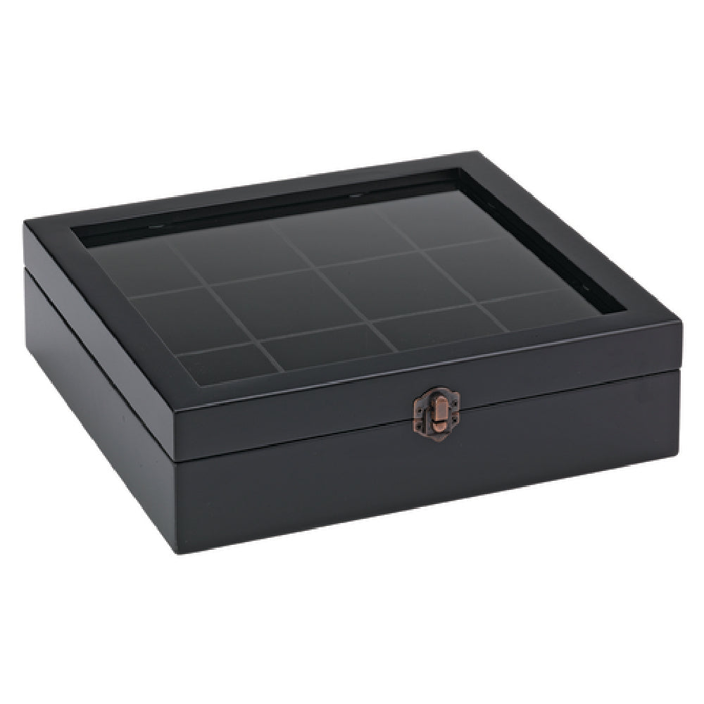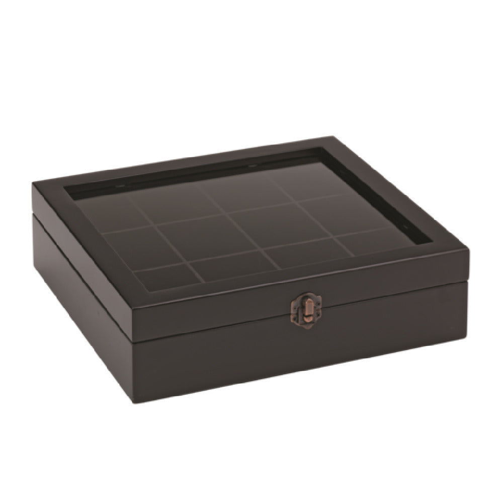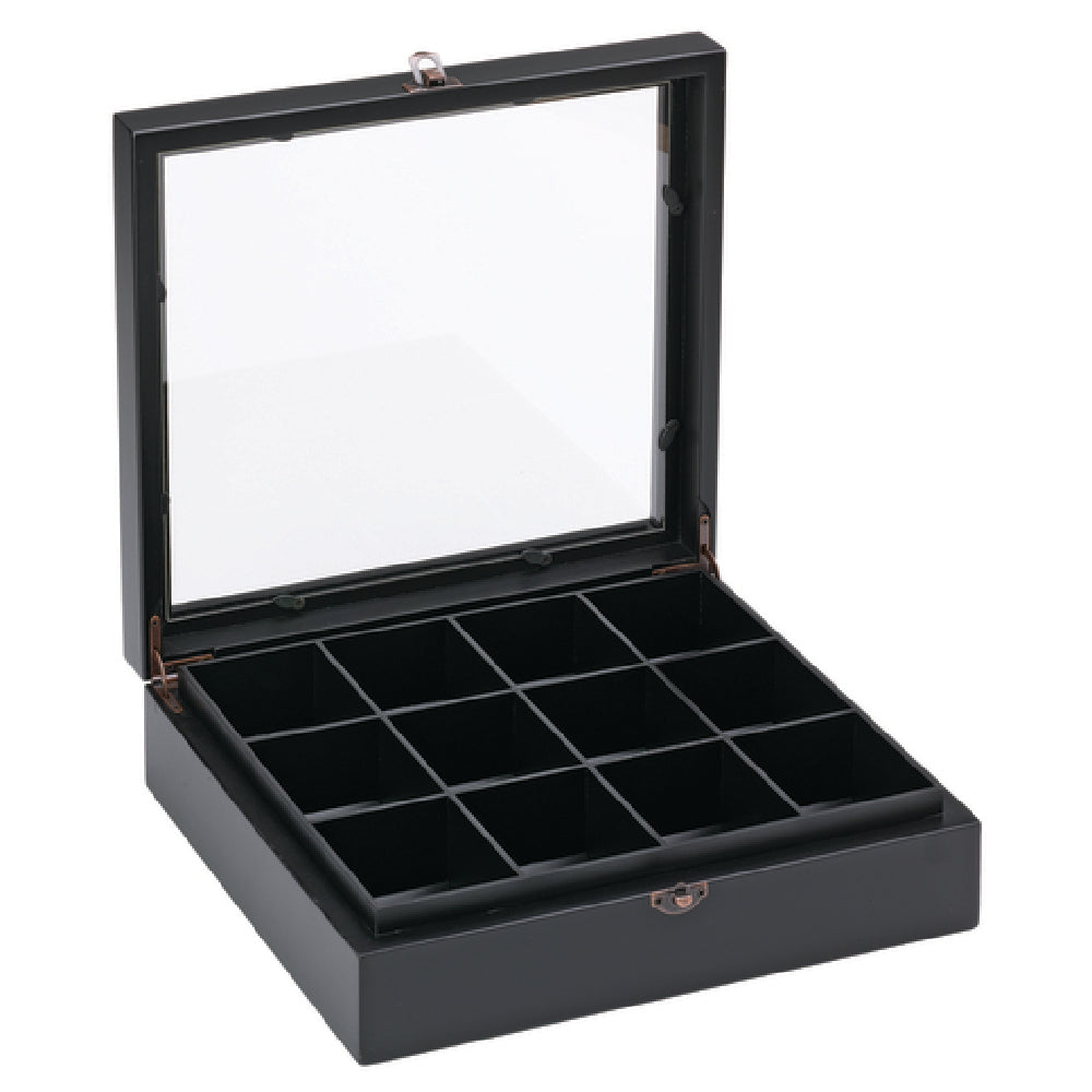Service Ideas, TB012, Tea Box, 11" x 10-1/2" x 3"H, (12) compartment, window top, hand wash, metal clasp, beechwood, black (Priced per each, packed 6 each per case)