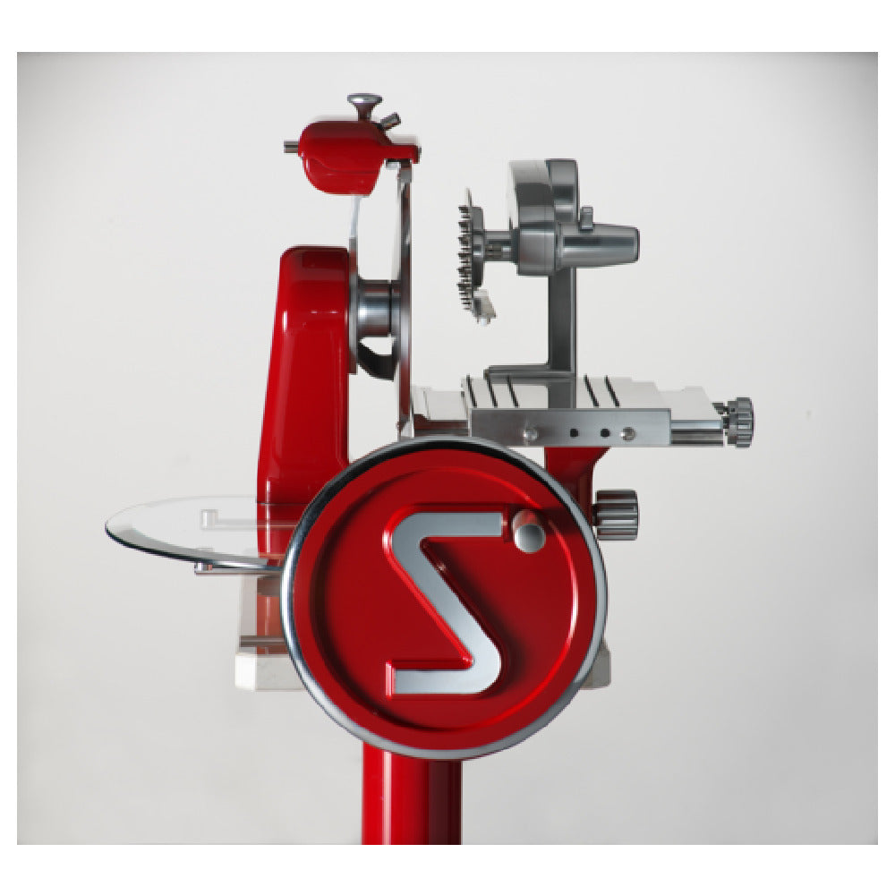 SIRMAN USA, 11357100N, ANNIVERSARIO LX 350 NSF - 14" set - Prosciutto Slicer, manual, flywheel, straight feed, 14" dia. chromium-plated knife, up to 1/8" slices, self-adjusting blocking arm with removable stainless steel carriage assembly, automatic feeding, removable built-in sharpener with aluminum assembly, cast iron & anodized aluminum alloy construction with epossidic paint, includes stand, NSF