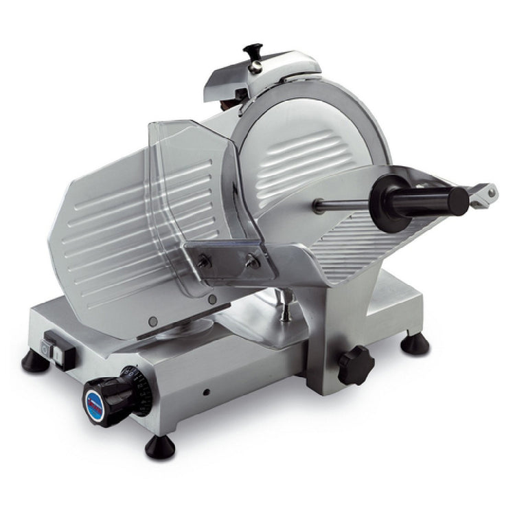 SIRMAN USA, 15303528, MIRRA 300 PLUS Food Slicer, Medium Duty, manual, gravity feed, belt driven, up to 1/2" slice thickness, 12" dia. chromium plated 100Cr6 forged carbon steel blade, ventilated motor, removable carriage with safety hand guard, removable built-in sharpener, chromed steel slide shaft, fan-cooled motor, anodized aluminum alloy construction, 1/3 HP, 245 watts, 120v/60/1-ph, 1.8 amps, UL, ETL-Sanitation
