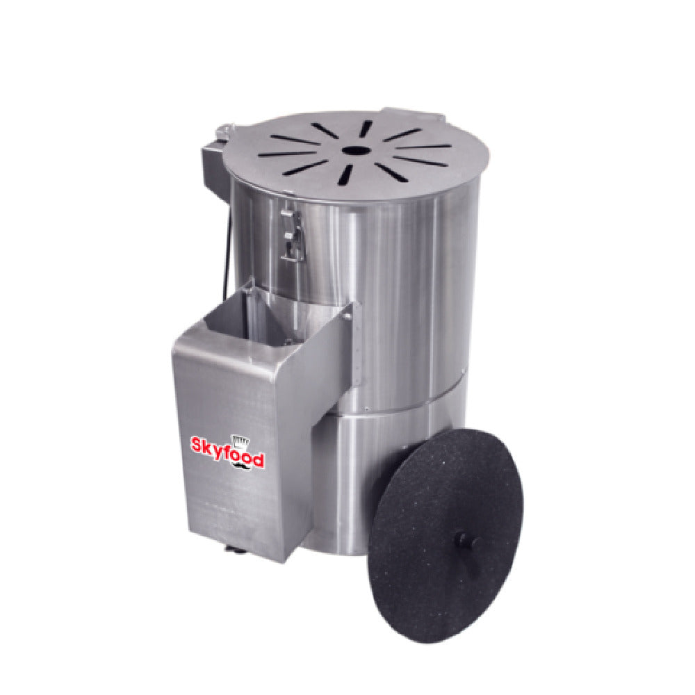 Skyfood Equipment , EL-10, Potato Peeler, electric, table style, 22 lb. capacity, 350 lbs/hour approximate production, 5 minute timer, large protected exit chute, stainless steel cover with safety switch, stainless steel body, 1/2 HP, 110v/60/1-ph