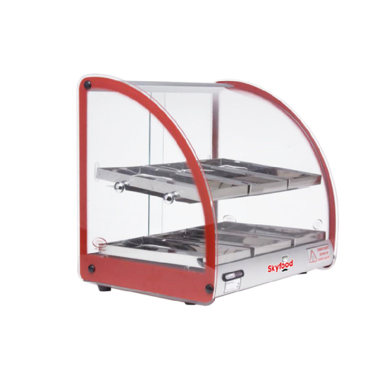Skyfood Equipment , FWD2-18R, Food Warmer Display Case, 18-1/2"W x 14-3/8"D x 17-1/2"H, (2) shelves with (3) stainless steel pans per shelf, curved front glass, tempered glass, (2) sliding rear glass doors, LED lighting, thermostat controlled, 304 stainless steel tubular heating element, stainless steel base, red & anodized aluminum exterior, 120v/60/1-ph, 250 watts, cULus, NSF