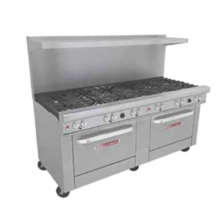 The Southbend 4721AA_NAT Ultimate Restaurant Range - gas - 72" is a powerhouse in professional kitchens, ideal for establishments demanding high efficiency and reliability. This range features twelve non-clog burners, ensuring uninterrupted cooking performance. Additionally, it is equipped with standing pilots for immediate ignition readiness. A standout feature is its dual convection ovens with battery spark ignition, each including three racks, providing ample space and versatility for multiple baking tasks. The product boasts a 22-1/2" flue riser with an integrated shelf, combining functionality with space-saving design. Constructed with stainless steel front, sides, and shelf, it guarantees durability and ease of maintenance. Adjustable 6" legs offer stability on uneven surfaces. With a remarkable output of 460,000 BTU, this range is certified by both CSA and NSF, attesting to its adherence to safety and health standards. The Southbend 4721AA_NAT is engineered for the demands of a busy restaurant environment, providing robust and versatile cooking capabilities to meet diverse culinary needs.
