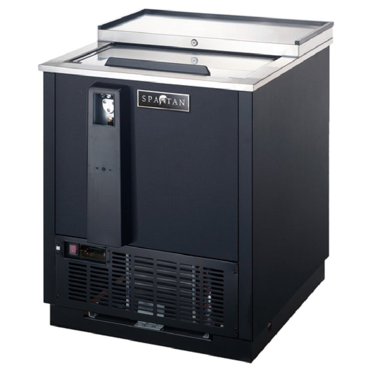 The Spartan SBC-27 Bottle Cooler is a compact yet efficient refrigeration solution, standing at 26-1/2 inches with a capacity of 4.0 cubic feet. This bottle cooler is equipped with a side-mounted self-contained refrigeration system, utilizing R290 Hydrocarbon refrigerant, making it both environmentally friendly and effective in maintaining optimal cooling conditions. It can accommodate approximately 4.5 cases of 12-ounce bottles and 6 cases of 12-ounce cans, making it suitable for establishments with varying beverage storage needs. The unit features a single stainless steel slide top locking lid, ensuring secure access and storage. Inside, adjustable dividers allow for flexible organization, while the built-in bottle opener and cap catcher add convenience for fast-paced service environments. The cooler's interior is lined with coated aluminum for durability, and the black vinyl-coated steel exterior adds a sleek, professional look that fits seamlessly into any commercial setting. Powered by a 1/6 HP motor and operating at 115 volts with a 60 Hz frequency, the Spartan SBC-27 consumes 2.04 amps of electricity, making it energy-efficient. It comes with a cord and NEMA 5-15P plug, and is cETLus and ETL-Sanitation certified, ensuring compliance with safety and sanitation standards. This versatile cooler is an asset for bars, restaurants, and cafes seeking reliable and efficient bottle cooling solutions.