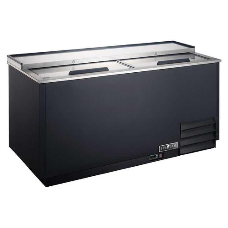 The Spartan SBGF-50 Glass Froster is engineered for high-capacity glass chilling, accommodating up to 240 10 oz. steins or 250 8" mugs, making it an essential tool for bars and restaurants with significant beverage service demands. Measuring 49.5" W x 26.75" D x 34.25" H, this unit offers ample space while maintaining a compact footprint. The froster features a self-contained front-mounted refrigeration system, optimized with R290 Hydrocarbon refrigerant and a 1/4 HP motor, operating efficiently on a 115v/60/1-ph power source with a 3.0 amp draw. User convenience and security are emphasized through its two stainless steel sliding lids equipped with locks, ensuring both easy access and safety. With adjustable dividers, the interior is versatile, accommodating various glass sizes and configurations within its coated aluminum space. The exterior boasts a black vinyl-coated steel finish, lending durability and a sleek appearance suitable for any commercial setting. This unit complies with cETLus and ETL-Sanitation standards, emphasizing its adherence to strict safety and sanitation guidelines. The Spartan SBGF-50 Glass Froster is designed to enhance operational efficiency and maintain high standards of quality in beverage service environments, offering a blend of capacity, functionality, and compliance.