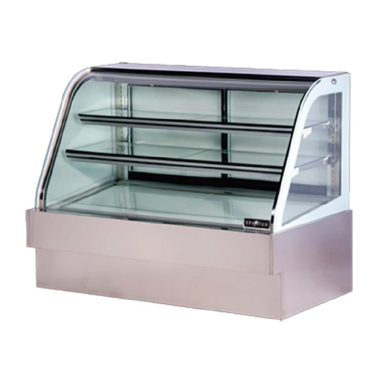 The Spartan SD-60 Curved Glass Deli Case - 59" Bottom Mounted Self-contained Refrigeration is a cutting-edge refrigeration unit designed for optimal food display and preservation. This deli case is equipped with a 1/2 HP compressor and utilizes R290 Hydrocarbon refrigerant, ensuring energy-efficient cooling. The unit operates on a 110v/60/1-ph electrical system with a 9.2 amp draw, compatible with a NEMA 5-15P plug. The 201 stainless steel exterior provides robust durability, while the anti-fog glass face offers clear visibility of displayed products. Inside, two adjustable glass shelves measuring 12" and 16" complement the 21" base, providing customizable display options. The interior lighting enhances product visibility, and the digital temperature display allows for precise temperature control. Two rear doors ensure easy access for stocking and retrieving items. Certified by cETLus and ETL-Sanitation, this deli case meets stringent safety standards. The Spartan SD-60 is ideal for delis, cafes, and supermarkets seeking a reliable and visually appealing refrigeration solution to enhance their food presentation and preservation capabilities.