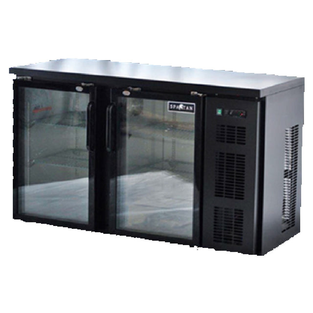 The Spartan SGBBB-58-SL Refrigerated Back Bar Cooler is a precision-engineered appliance characterized by its shallow depth of 57.6 inches, specifically designed to accommodate versatile commercial environments. This two-section cooler has a 12.0 cu. ft. storage capacity, combining functionality with compactness. It features a right side-mounted self-contained refrigeration system, utilizing the environmentally friendly R290 Hydrocarbon refrigerant, powered by a 1/4+ HP motor, operating at 110v/60/1-ph and drawing 2.6 amps. The cooler's design includes hinged anti-fog glass doors that ensure clear visibility and easy access, supported by four adjustable shelves for customizable storage options. The digital temperature control maintains precise cooling, while interior lighting enhances visibility. Externally, the cooler boasts a sleek black top and durable black vinyl exterior, while internally it is lined with 304 stainless steel, ensuring both aesthetics and hygiene. The unit is equipped with a NEMA 5-15P plug and is certified by cETLus and ETL-Sanitation, confirming its compliance with safety and sanitation standards. The Spartan SGBBB-58-SL is an optimal choice for bars, restaurants, and hospitality venues seeking efficient, reliable, and stylish refrigeration solutions. Its combination of advanced technology, robust materials, and practical design meet the demands of diverse industry segments.
