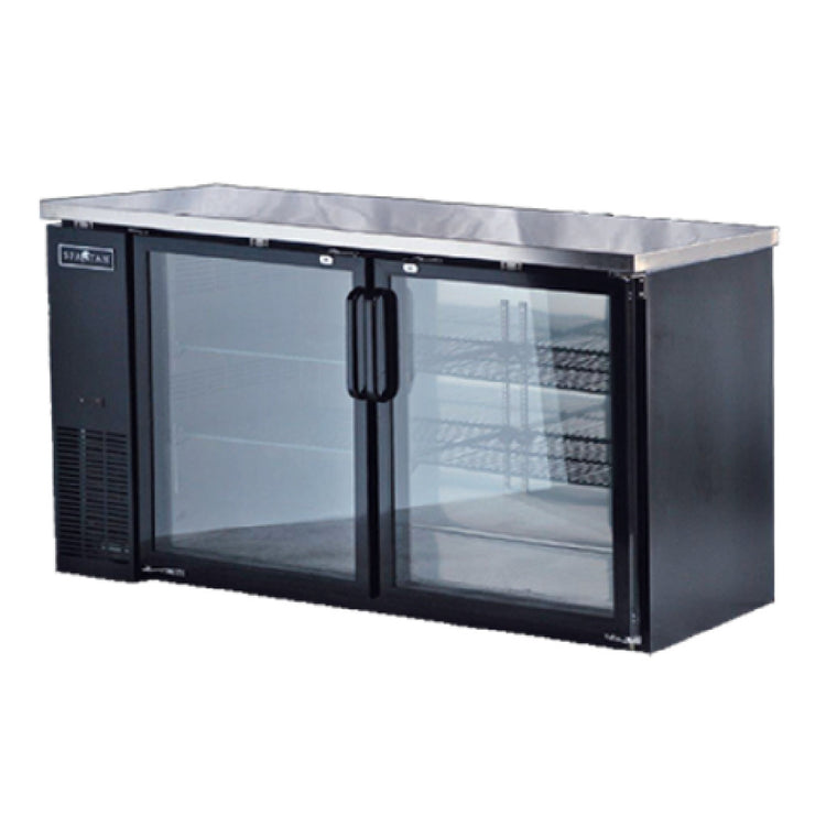 The Spartan SGBBB-60 Back Bar 60.75" Two-section is an advanced refrigeration solution designed for professional bar settings, enhancing both functionality and style. With a generous capacity of 15.8 cubic feet, this unit accommodates a wide array of beverages within its two sections. Featuring left side mounted self-contained refrigeration, it ensures efficient cooling performance using the environmentally friendly R290 Hydrocarbon refrigerant. The hinged anti-fog glass doors provide clear visibility while maintaining optimal internal conditions, supported by the digital temperature control that allows precise adjustments. The interior is illuminated for easy accessibility, complemented by four adjustable shelves that offer flexible storage configurations. Constructed with a durable stainless steel top and a sleek black vinyl exterior, it integrates seamlessly into any bar environment. The interior is crafted from 304 stainless steel, guaranteeing longevity and resistance to corrosion. Powered by a 1/3+ horsepower motor and operating at 115 volts/60/1-phase with 7.5 amps, the Spartan SGBBB-60 is equipped with a NEMA 5-15P plug. Certified by cETLus and ETL-Sanitation, this back bar refrigerator meets stringent safety and sanitation standards, making it an ideal choice for commercial settings. Its thoughtful design and technological sophistication cater to a variety of industry-specific needs.