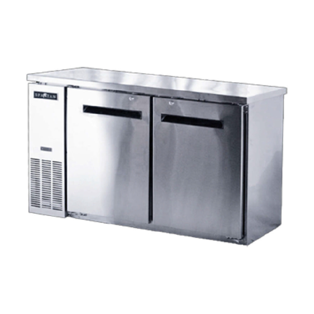 The Spartan SSBB-48 Back Bar 48.8" Two-section is a versatile refrigeration unit designed to meet the needs of hospitality and food service industries. This model boasts a generous capacity of 11.8 cubic feet, making it ideal for businesses requiring efficient beverage storage solutions. Its side-mounted, self-contained refrigeration uses R290 Hydrocarbon refrigerant, known for its environmental benefits, and operates with a powerful 1/3+ HP compressor. The unit's 115v/60/1 electrical specification and 7.2 amps draw ensure compatibility with standard outlets, featuring a NEMA 5-15P plug for ease of installation. Constructed with a robust 430 stainless steel exterior and a 304 stainless steel interior, the Spartan SSBB-48 guarantees durability and a sleek appearance, enhancing any bar setting. This back bar cooler includes two hinged solid doors and four adjustable shelves, allowing customization to suit various product dimensions. Its digital temperature control ensures precise cooling management, while the interior lighting provides visibility, aiding in quick product retrieval. Certified by cETLus and ETL-Sanitation, this refrigeration unit adheres to strict safety and sanitation standards, making it a reliable choice for busy bars and restaurants looking for efficient, high-quality beverage storage solutions.