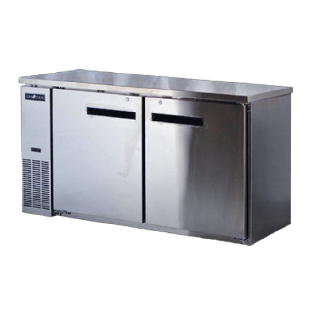 The Spartan SSBB-60 Back Bar 60.75" Two-section is an advanced refrigeration unit ideal for commercial use in bars and kitchens, equipped with a 15.8 cubic feet capacity to efficiently store beverages and perishables. This back bar cooler features a side-mounted self-contained refrigeration system, ensuring optimal cooling performance with the use of eco-friendly R290 Hydrocarbon refrigerant. It has a powerful 1/3+ horsepower compressor and operates at 115v/60/1-phase, drawing 7.5 amps and compatible with NEMA 5-15P outlets. The unit includes (4) adjustable shelves, allowing customization based on storage needs. It is designed with hinged solid doors for secure access and interior lighting to enhance visibility of stored items. The exterior is constructed from 430 stainless steel, while the interior boasts 304 stainless steel, offering durability and resistance to corrosion. The digital temperature control provides precise regulation, ensuring consistent cooling temperatures. Certified by cETLus and ETL-Sanitation, the SSBB-60 meets stringent safety and sanitation standards, making it a reliable choice for establishments aiming for quality and hygiene. This product presents a blend of functionality and robust construction, catering to the diverse refrigeration requirements of the food and beverage industry.