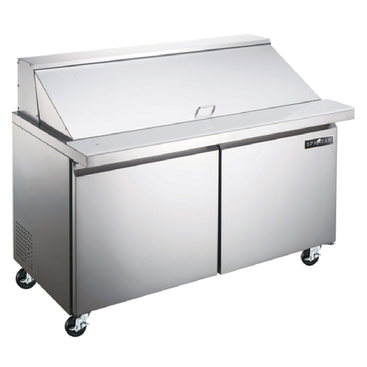 The Spartan SST-48-18 Mega Top Sandwich/Salad Prep Unit Two-section is a highly efficient refrigeration solution with a capacity of 12.0 cubic feet designed for commercial kitchens. Featuring a rear-mounted self-contained refrigeration system, it uses the eco-friendly R290 Hydrocarbon refrigerant. This unit is engineered with a self-closing stainless steel door to maintain optimal temperature control and energy efficiency. It comes equipped with two adjustable plastic-coated steel shelves and can accommodate up to 18 pans of 1/6 size, offering substantial storage flexibility. The 3/4" thick cutting board provides an ample workspace for food preparation. Constructed with a sturdy 430 stainless steel exterior and a 304 stainless steel interior, this unit is built for durability and longevity. Designed for ease of mobility, it includes four casters, with the front two being lockable for stability. The digital temperature control ensures precise temperature management, supported by its 1/3 HP motor running on 120v/60/1-ph, pulling 8.1 amps, and utilizing a NEMA 5-15P plug. Recognized for its adherence to sanitation standards, it is certified by cETLus and ETL-Sanitation, making it a reliable choice for restaurants, sandwich shops, and salad bars aiming to enhance their food preparation efficiency and storage capabilities.