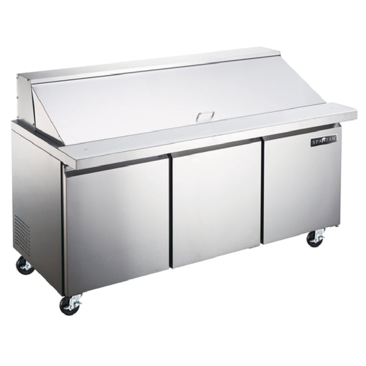 The Spartan SST-72-30 Mega Top Sandwich/Salad Prep Unit Three-section is a high-capacity refrigeration solution, perfect for busy food service environments. With a spacious 18.0 cubic feet interior, it offers ample storage, supported by three adjustable plastic-coated steel shelves. This unit accommodates up to thirty 1/6 size pans, making it ideal for restaurants and catering services that require versatile ingredient organization. The unit is constructed with a robust 430 stainless steel exterior and a 304 stainless steel interior, ensuring durability and easy cleaning. Equipped with a rear-mounted self-contained refrigeration system, it utilizes R290 Hydrocarbon refrigerant for efficient cooling. The self-closing stainless steel door enhances energy efficiency, while the 3/4" thick cutting board provides a convenient workspace for food preparation. For ease of mobility and secure positioning, the unit is fitted with four casters, two of which are front-locking. The digital temperature control allows precise climate management, accommodating the diverse needs of food service operations. Powered by a 1/2 HP motor, the unit operates on 120v/60/1-ph, drawing 9.2 amps and features a NEMA 5-15P plug. Certified by cETLus and ETL-Sanitation, the Spartan SST-72-30 is a reliable choice for maintaining food safety and quality in any commercial kitchen setting.