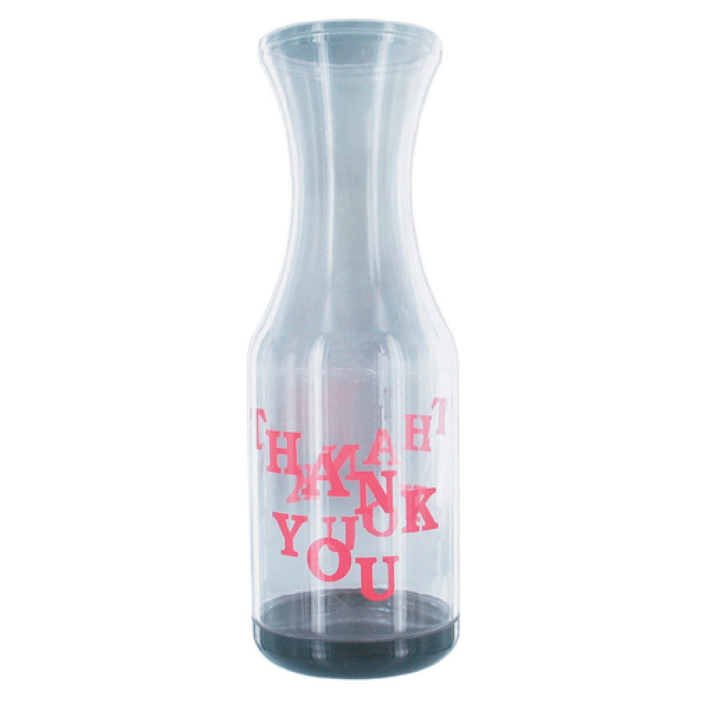 The Spill-Stop 181-01 Tip Jar is a uniquely designed, carafe-shaped container measuring 10-3/4 inches in height, making it an ideal choice for businesses seeking a visually appealing way to encourage gratuities. Crafted from clear plastic, this tip jar provides durability and ease of monitoring contents while maintaining a sleek aesthetic. It features the phrase "Thank You" imprinted in red letters, adding a touch of gratitude that enhances customer interaction. One of its standout attributes is the unscrewable bottom, which facilitates effortless access for tip retrieval and simplifies the cleaning process, making it a practical solution for high-traffic environments. This feature ensures that the jar can be quickly emptied and reassembled, maximizing its efficiency in settings such as cafes, restaurants, and bars. The Spill-Stop 181-01 Tip Jar's thoughtful design and functional features cater to a variety of market segments within the hospitality industry, offering a combination of style and practicality that stands out in customer-facing environments.