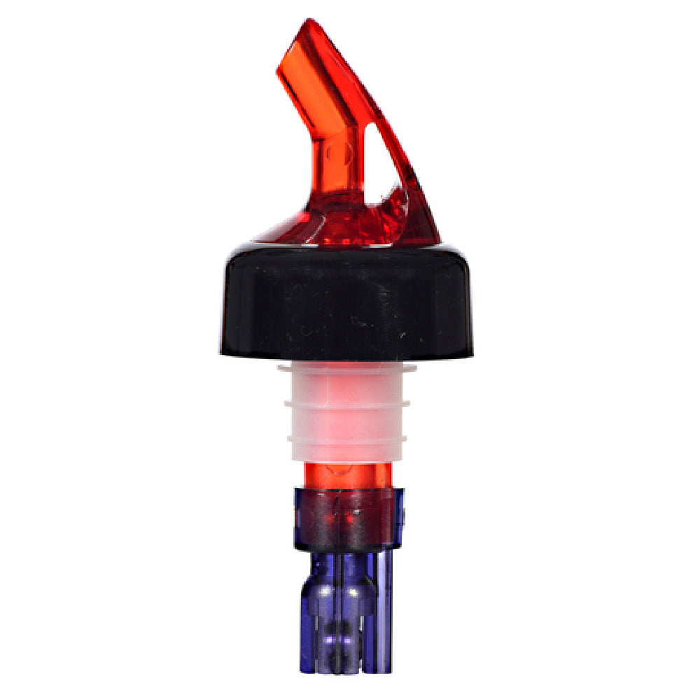 The Spill-Stop 789-25 Pourer is a high-quality, imported beverage accessory meticulously designed to enhance the precision and efficiency of liquid dispensing. This pourer features a 1-1/8 oz. capacity, making it an ideal choice for both professional bartenders and home enthusiasts who require consistent and controlled pouring. Crafted from durable plastic, the pourer is both lightweight and resilient, ensuring longevity even with regular use. Its distinctive red color, complemented by a sleek black collar, not only adds a touch of aesthetic appeal but also facilitates easy identification and quick installation on a variety of bottle sizes. The Spill-Stop 789-25 is engineered to prevent spills and leaks, which is crucial for maintaining clean workspaces and minimizing waste in environments ranging from busy bars to casual home settings. This product's technical specifications cater to a broad audience within the beverage industry, offering a reliable solution for efficient liquid management. The combination of its precise volume control and durable construction highlights its unique value proposition, distinguishing it as an essential tool for those seeking to optimize their beverage service operations.