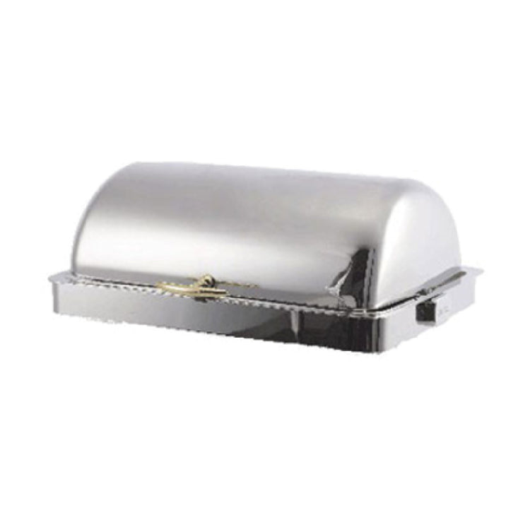 The Spring USA 2546-697A Rondo Built-in Chafer Full Size 8.4 to 14.8 Qt. is a versatile chafing solution designed for high-volume food service environments. This full-size chafer measures 26"L x 18-9/10"W x 9"H and accommodates a food capacity ranging from 8.4 to 14.8 quarts, making it suitable for a wide array of culinary applications. Its rectangular shape and roll top lid allow for easy access and service, enhancing efficiency during meal service. The chafer includes a 12" x 20" insert pan and features an elegant mirror-polished trim ring, which adds a touch of sophistication to any buffet setup. The all-angle resistance axle system ensures smooth operation of the lid, while the heating element (model 9506/1) with adjustable control provides precise temperature management. Notably, the unit is adorned with gold accents, adding a premium aesthetic. Constructed from 18/10 stainless steel with a mirror polish finish, it combines durability with an attractive appearance. The Spring USA 2546-697A is NSF certified, ensuring it meets public health and safety standards. Operating on 110-120/60/1-ph, it requires a 5.8 amp and 700-watt power supply, making it a reliable choice for professional foodservice settings.