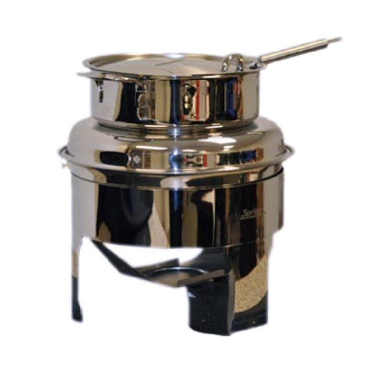 The Spring USA 3375-6/6 Suite Server Soup Station 6 Qt. is a versatile and elegant solution for serving soups in a variety of settings, such as hotels, restaurants, and catering events. This soup station features a generous 6-quart capacity, making it suitable for both small and large gatherings. With dimensions of 11-7/8" in diameter and 16-1/2" in height, it is compact yet spacious enough to accommodate substantial servings. The soup station includes a hinged and notched cover, allowing for easy access while maintaining temperature and moisture levels. The polished 18/10 stainless steel construction, complemented by chrome accents, not only ensures durability and longevity but also adds a touch of sophistication to any serving area. Designed to be used with the 9503 electric heating element, it provides consistent heat distribution, ensuring soups are served at optimal temperatures. The inclusion of a sturdy stand enhances its stability, making it a reliable choice for high-traffic environments. The Spring USA 3375-6/6 Suite Server Soup Station's combination of practical features and stylish design makes it a valuable asset for professionals in the food service industry looking to elevate their presentation and serve quality soups with ease.