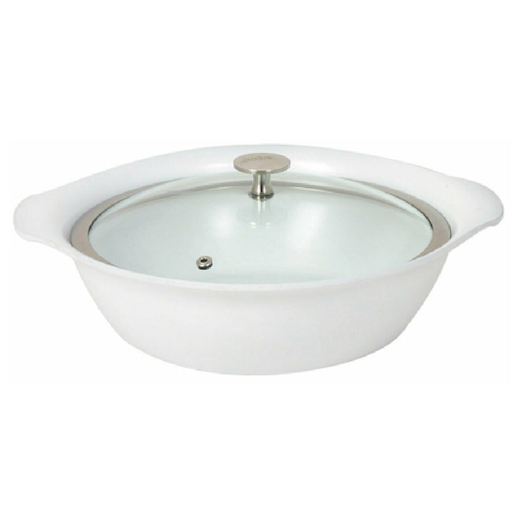 The Spring USA 8258-2/27 Motif Casserole Pan is a meticulously crafted cooking instrument, featuring a 3-quart capacity ideal for diverse culinary applications. With precise dimensions of 10-3/4 inches in diameter and 3-1/4 inches in depth, this round casserole pan is designed for both efficiency and versatility in the kitchen. It comes equipped with a tempered glass cover that enhances heat retention while allowing for convenient monitoring of the cooking process. The pan's interior boasts a durable Teflon® non-stick surface combined with QuanTanium® technology, ensuring superior performance by providing excellent resistance to scratching and cooking efficiency. The construction is fortified with a coated stainless steel induction base, suitable for various heat sources, catering to a wide range of professional and home cooking environments. The exterior of the pan is two-ply, constructed from cast aluminum with a ceramic reinforced finish, adding to its durability while maintaining a lightweight profile for easy handling. Available in a classic white hue, the Spring USA Motif Casserole Pan stands as a stock item suitable for both professional chefs and home cooks seeking reliable, long-lasting kitchenware that combines functionality with aesthetic appeal.