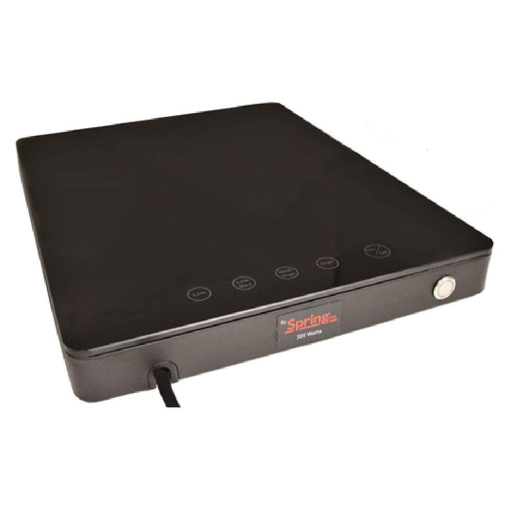 The Spring USA SM-300LP LoPRO™ Slim-Line Holding Induction Range Countertop Single is a compact yet powerful solution for precise temperature control, ideal for professional kitchens seeking efficiency and reliability. With dimensions of 11-13/16" W x 14-3/4" D x 1-9/16" H, this low-profile induction range fits seamlessly into various countertop spaces. It features a 5mm tempered glass top that ensures durability and easy cleaning. The unit offers a 4-position set-hold temperature control with a temperature range of Low 145-155°F (62-68°C), Low-Med 156-165°F (69-73°C), Med-High 166-175°F (74-79°C), and High 176-185°F (80-85°C), allowing for precise heat management. Equipped with SmartScan® technology and solid-state controls, it provides over/under voltage protection and touch controls with indicator lights for user-friendly operation. The lock push-button and pan recovery feature enhance safety and convenience. Its non-skid/non-scratch base ensures stability, while the black housing adds a sleek, professional appearance. Operating at 300 watts and 110-120v/60/1-ph, it uses a NEMA 5-15P plug. The range is ETL, UL-STD 197, FCC, cETLus, and ETL-Sanitation to NSF-4 certified, making it a reliable choice for maintaining food at safe, consistent temperatures across various culinary environments.