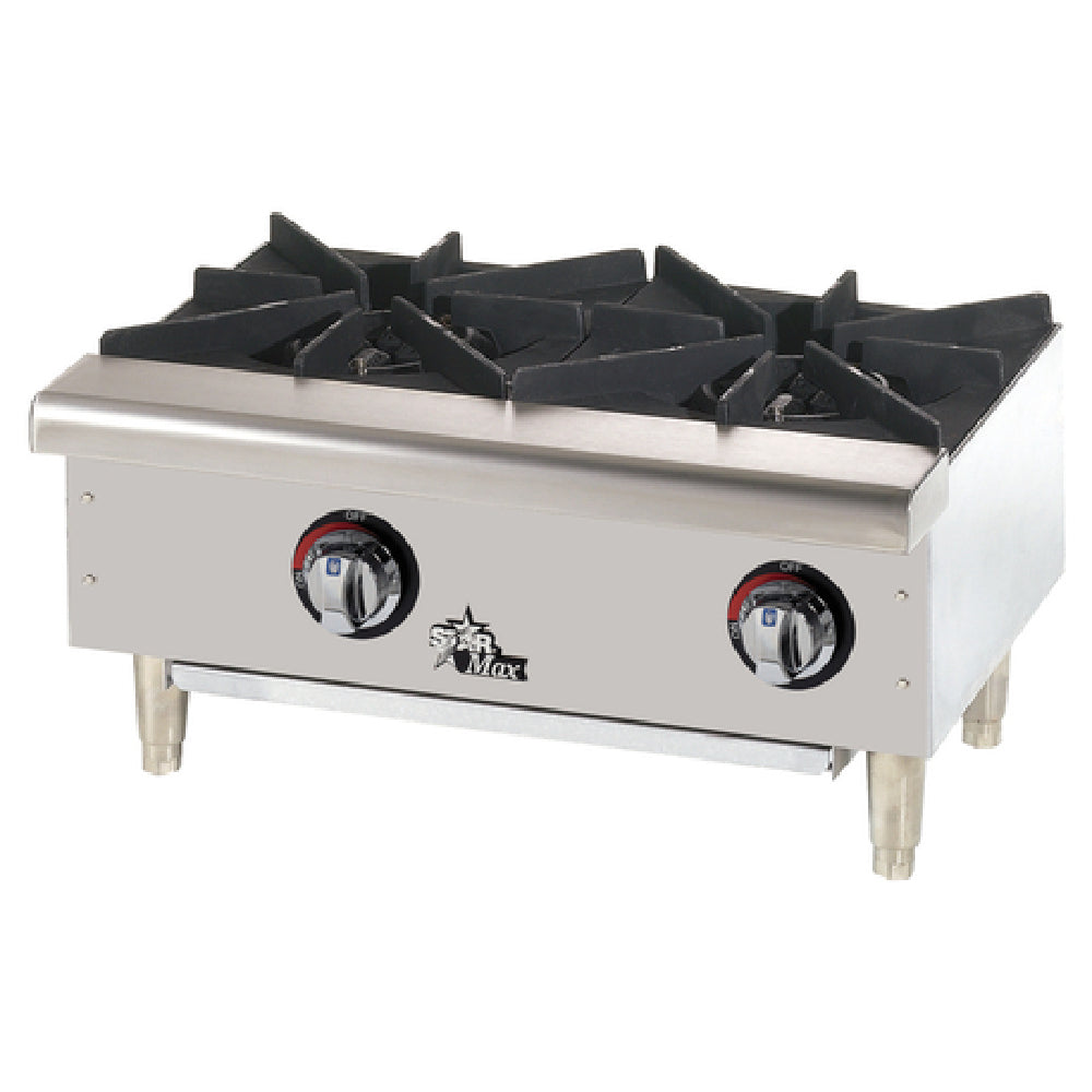 The Star 602HWF Star-Max® Hotplate Countertop Gas is a versatile cooking solution, designed to meet the high demands of commercial kitchens across various sectors. This 24-inch wide hotplate features two robust cast iron burners placed side-by-side, delivering a powerful 50,000 BTU for efficient cooking performance. Its manual controls allow users precise management of heat levels, catering to different cooking requirements. Constructed with heavy-duty cast iron grates, the hotplate ensures durability and consistent heat distribution. The inclusion of a drip tray makes maintenance straightforward, while the heavy-duty knobs provide reliability and ease of use. It boasts a stainless steel front complemented by an aluminized steel body, offering a sleek and durable exterior. The 4-inch adjustable legs enable stability and adaptability on various countertop surfaces. Shipping configured for natural gas, it also includes an LP conversion kit, ensuring flexibility for different gas setups. Certified by NSF, CSA, and CGA, this hotplate meets rigorous health and safety standards, making it a trusted choice for professional culinary environments. The Star 602HWF Star-Max® Hotplate is designed for those seeking reliable performance in a compact, efficient format, ideal for restaurants, catering services, and other food service operations.