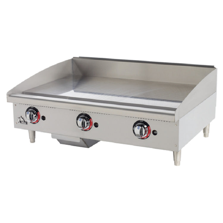 The Star 636TSPF Star-Max® Heavy Duty Griddle Gas Countertop is a robust and reliable cooking appliance engineered for demanding culinary environments. With a generous 36-inch width and 21-inch depth cooking surface, it provides ample space for diverse cooking needs. The griddle features a 1-inch thick steel plate, ensuring consistent heat distribution and excellent thermal retention. Its electronic snap-action thermostat, placed every 12 inches, allows precise temperature control, enhancing cooking efficiency. Built with heavy-duty knobs, it offers durability and ease of use. The wrap-around stainless steel splash guard enhances cleanliness by containing splatters, while the grease trough and stainless steel drawer facilitate easy maintenance and waste management. Constructed with a welded steel frame and a stainless steel front, this griddle combines durability with an attractive design. Supported by 4-inch legs, it provides stability during operation. Operating at 84,900 BTU, it delivers substantial cooking power, making it suitable for high-volume kitchens. Certified by cULus and UL EPH Classified, it adheres to stringent safety and performance standards. Proudly made in the USA, the Star 636TSPF ships with natural gas compatibility, including an LP conversion kit, catering to versatile fuel requirements. This product is ideal for restaurants and food service establishments seeking reliability and performance.