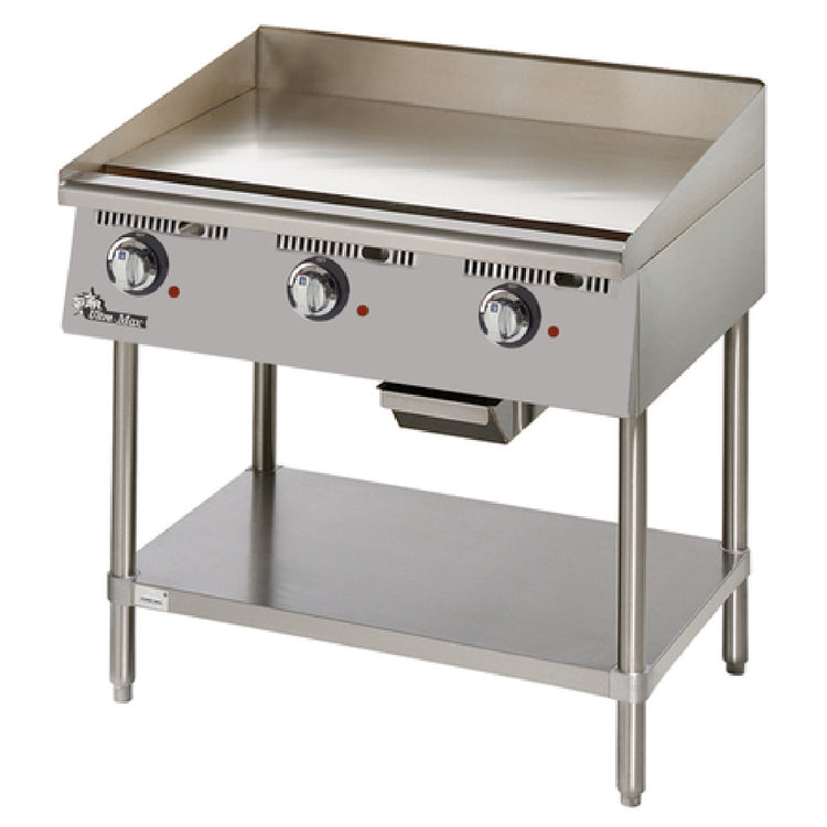 The Star 736TA Ultra-Max® Heavy Duty Griddle Electric Countertop is a robust and efficient cooking appliance designed for professional kitchens. This griddle features a spacious 36" W x 24" D cooking surface, crafted from a 1" thick polished steel griddle plate, ensuring durability and even heat distribution. It operates with a precise 150°-450°F snap-action thermostat and boasts a powerful 4350-watt element every 12", facilitating consistent cooking temperatures and performance. The griddle is equipped with a 5" tapered wrap-around splash guard to minimize mess and a 3-1/2" front grease trough for efficient grease management. Additionally, it includes a 6 qt. grease drawer for easy cleanup. Users will appreciate the control provided by heavy-duty metal knobs, and the sturdy welded steel frame with a sleek stainless steel exterior offers both longevity and aesthetic appeal. Supported by 4" legs with 1-5/8" adjustment capability, the griddle ensures stable positioning on any countertop. This product is cULus and UL EPH Classified, underscoring its compliance with safety standards, and is proudly made in the USA. The Star 736TA is ideal for restaurants and foodservice operations, promising reliability and high performance for diverse culinary applications.