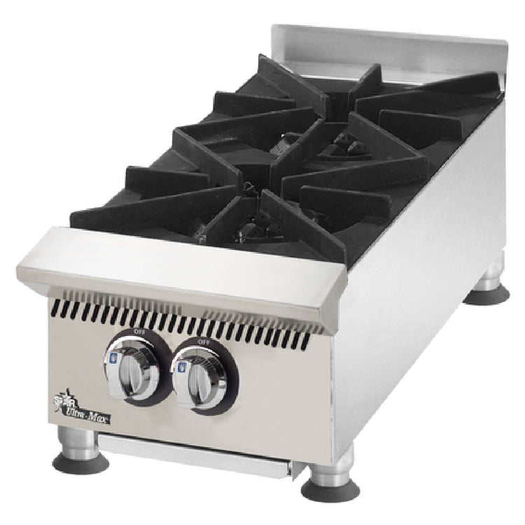 The Star 802HA_NAT Ultra-Max® Hotplate Countertop Gas is a high-performance cooking solution, meticulously engineered for professional kitchens requiring efficient heat distribution and precise control. Measuring 12 inches in width, this compact yet powerful unit features two robust 30,000 BTU cast iron burners, delivering a total output of 60,000 BTUs. This makes it ideal for a variety of culinary applications, from rapid boiling to gentle simmering. The heavy-duty cast iron grates provide durability and stability, accommodating various cookware sizes with ease. Further enhancing its utility, the hotplate incorporates manual controls and heavy-duty chrome knobs, allowing chefs to fine-tune the cooking process meticulously. A thoughtfully designed drip tray ensures easy cleanup, maintaining hygiene standards in busy kitchen environments. The exterior, crafted from stainless steel with a cool-touch bullnose, combines resilience with safety, while the 4-inch adjustable legs offer flexibility in positioning the appliance on any countertop. This model is cULus and UL EPH Classified, underlining its compliance with rigorous safety and sanitation standards. Proudly made in the USA, the Star 802HA_NAT Ultra-Max® Hotplate is a versatile choice for culinary professionals seeking reliability and performance in a compact footprint.