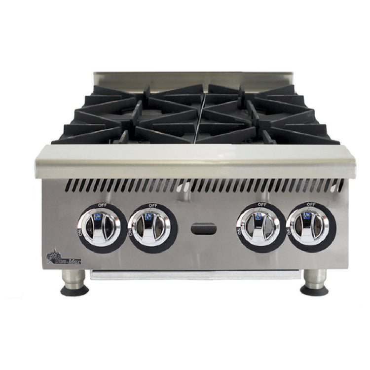The Star 804HA_LP Ultra-Max® Hotplate is a versatile countertop gas appliance, expertly designed for commercial kitchens seeking reliability and efficiency. Measuring 24 inches wide, this hotplate features four robust 30,000 BTU cast iron burners, providing a total output of 120,000 BTU. These burners are equipped with manual controls, allowing for precise heat adjustments crucial for various cooking techniques. The heavy-duty cast iron grates ensure durability and provide a stable cooking surface capable of withstanding high temperatures. Complementing the design, the hotplate includes a drip tray for easy maintenance and heavy-duty chrome knobs for enhanced durability. The exterior is constructed from stainless steel, ensuring a long-lasting, sleek appearance, and features a cool touch bullnose for user safety. Adjustable 4-inch legs offer stability on any countertop, accommodating diverse kitchen layouts. Certified by cULus and UL EPH, this hotplate meets stringent safety and sanitation standards, making it a dependable choice for restaurants, catering services, and other food service operations. Proudly made in the USA, the Star 804HA_LP Ultra-Max® Hotplate combines quality craftsmanship with superior cooking performance, tailored to meet the demanding needs of the food industry.