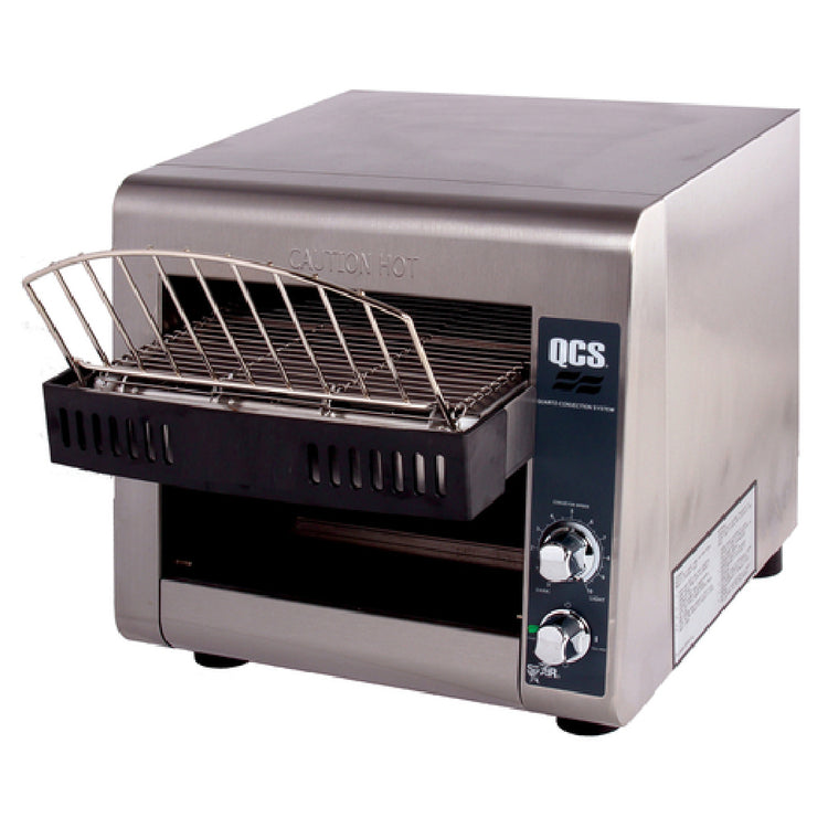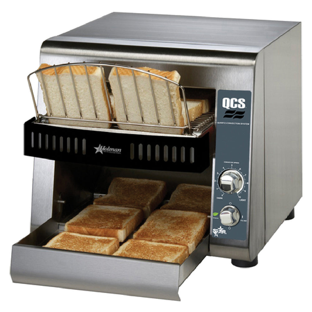 The Star QCS1-350 (QUICK SHIP) (MIDDLEBY ESSENTIALS ITEM) Holman QCS® Conveyor Toaster is an efficient and reliable appliance designed for high-volume commercial food service environments. This electric conveyor toaster boasts a production capacity of 350 slices per hour, making it suitable for busy kitchens and cafes. Featuring a horizontal conveyor and analog speed control, it allows users to customize the toasting process according to their specific needs. The toaster is equipped with quartz sheathed heater elements on both the top and bottom, ensuring even heat distribution for perfect results every time. With a 1-1/2" opening and a 10" wide belt, this unit accommodates up to two slices simultaneously, facilitated by a convenient loading rack. Constructed with durable stainless steel, the toaster has a smooth cool touch exterior, ensuring safety and durability in fast-paced settings. Certified by cULus and UL EPH Classified, it meets rigorous industry standards for safety and performance. The Star QCS1-350 ships within four days, offering a quick solution for businesses requiring immediate equipment upgrades. Its robust design and efficient operation make it an invaluable asset in any commercial setting requiring consistent, high-quality toasting capabilities.